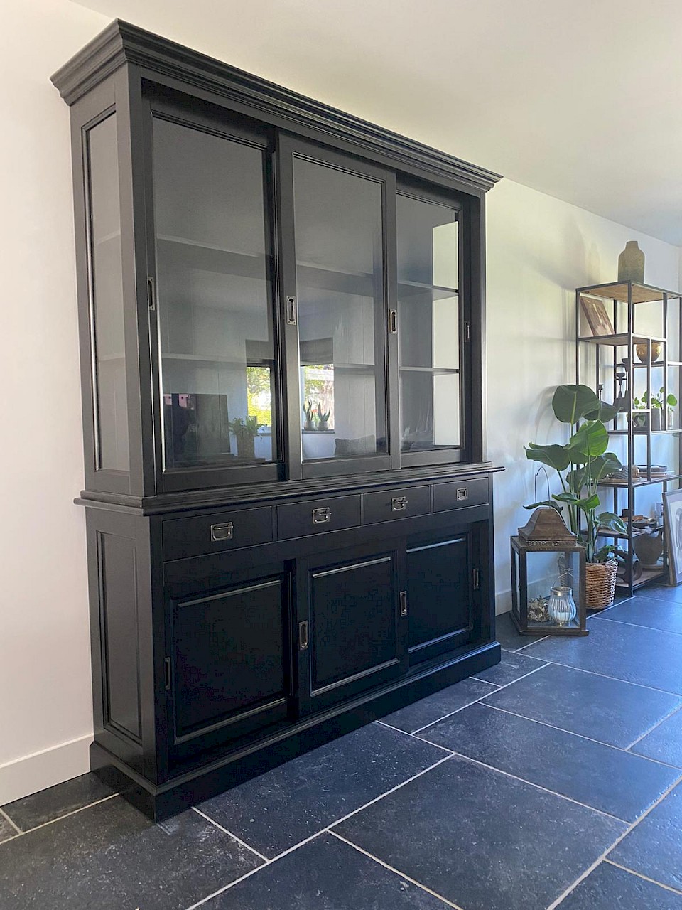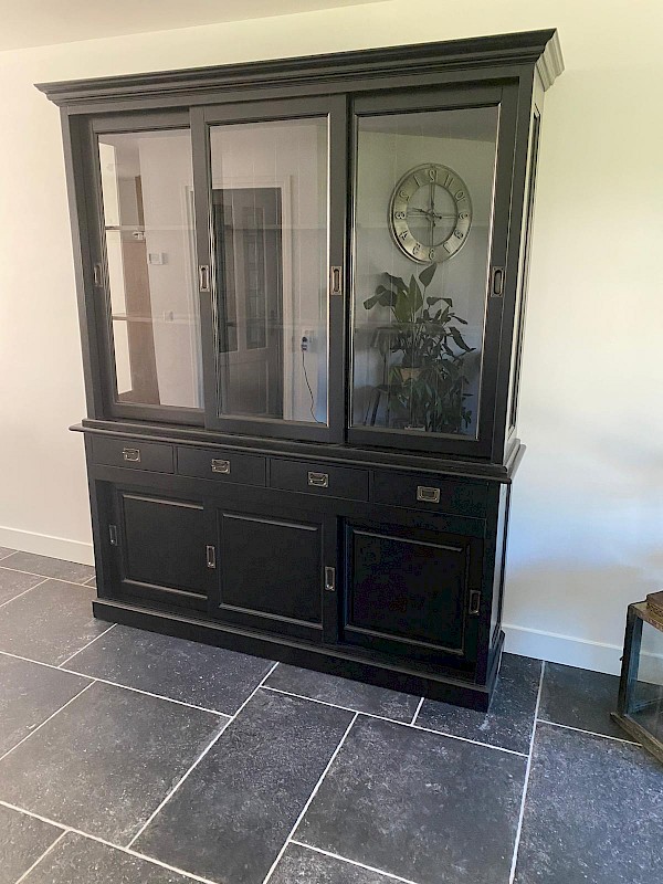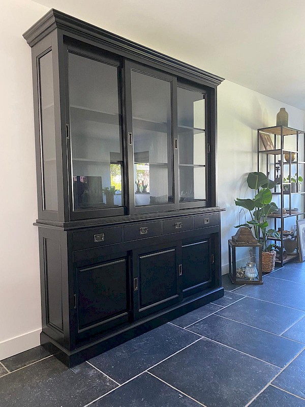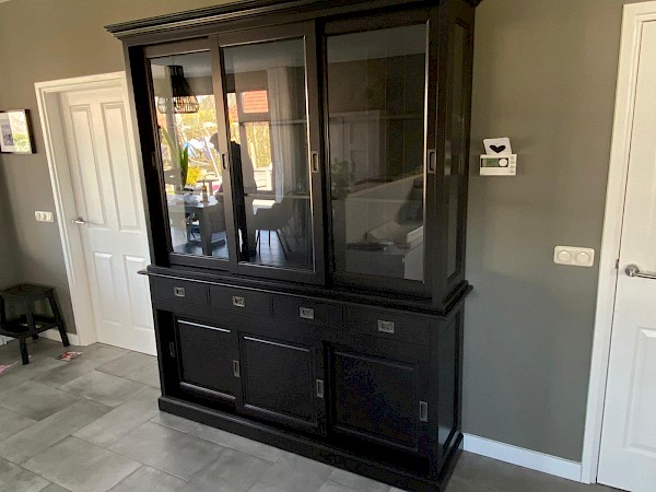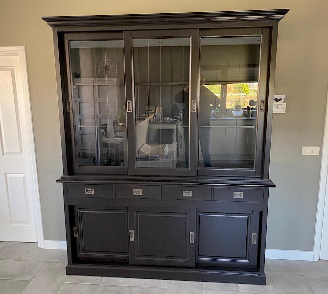 Deze prachtige zwarte buffetkastkast kan de blikvanger zijn in uw woonruimte! Een tijdloze uitstraling waardoor deze zowel in een modern als klassiek interieur past. De kast bevat 3 schuifdeuren, zowel boven als onder, daarnaast een aantal lades. Vervaardiging is uitgevoerd met hoge kwaliteit, waardoor lades schuiven op geleiders en deuren hangen in een ijzeren rails. Deze mooie kast bestaat uit 2 gedeeltes, waardoor makkelijk te vervoeren. De diepte van schappen: 29 boven en 32 onder.