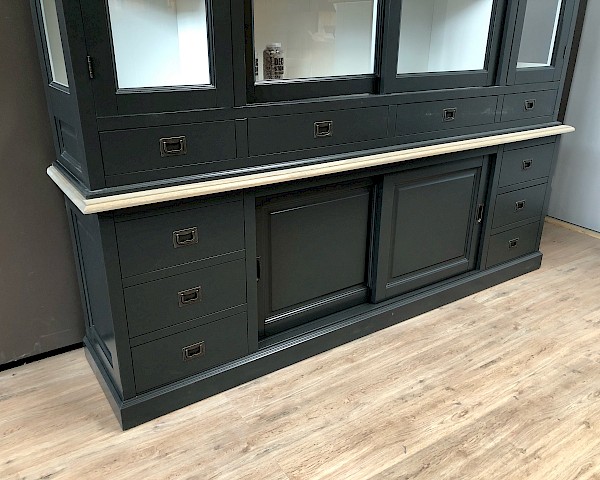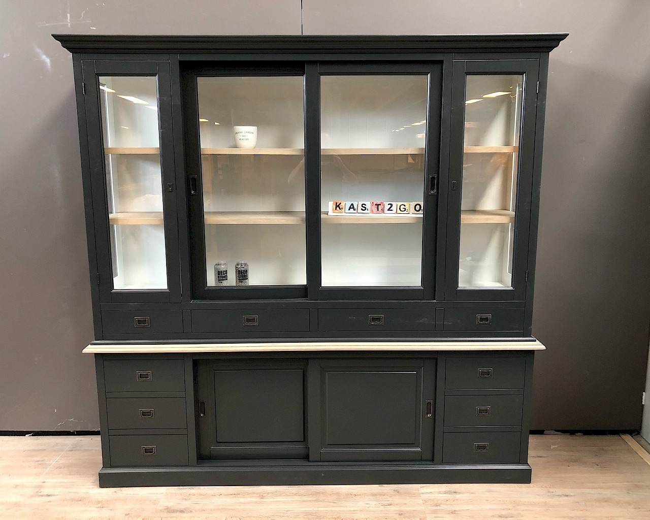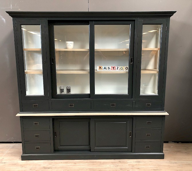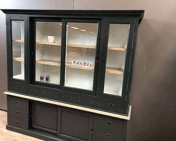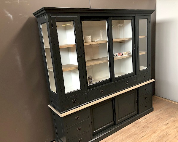 De zijkanten van de bovenste kast zijn gemaakt van glas, wat een mooi uitzicht en licht in de kast geeft.