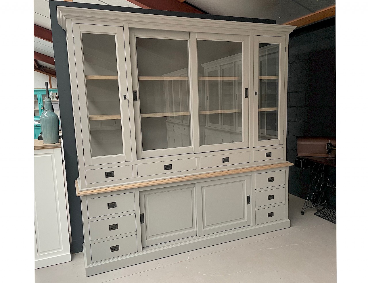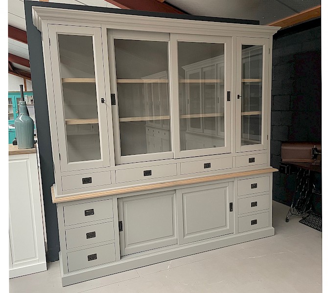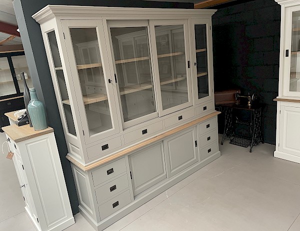 De zijkanten van de bovenste kast zijn gemaakt van glas, wat een mooi uitzicht en licht in de kast geeft.