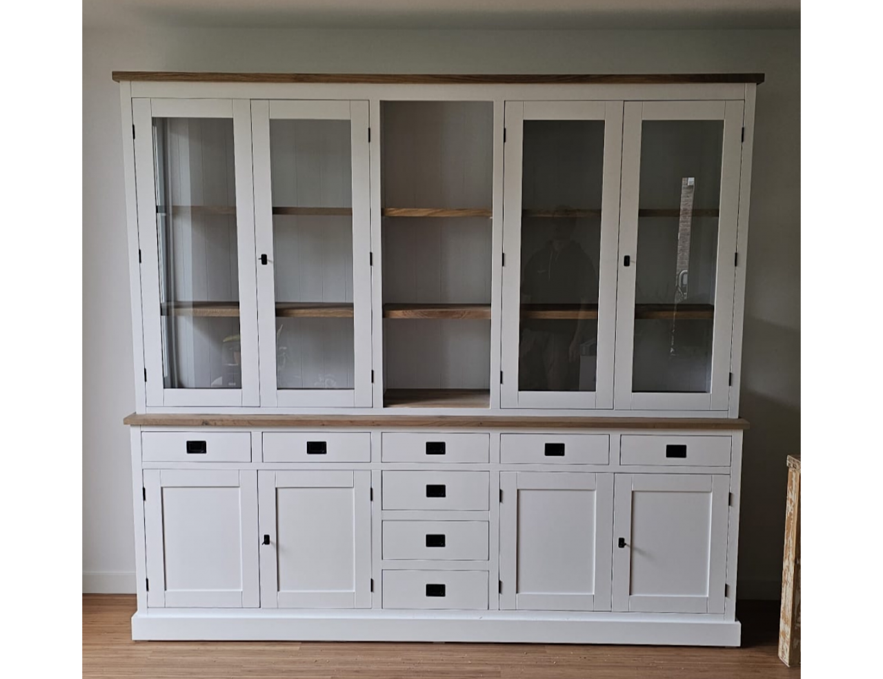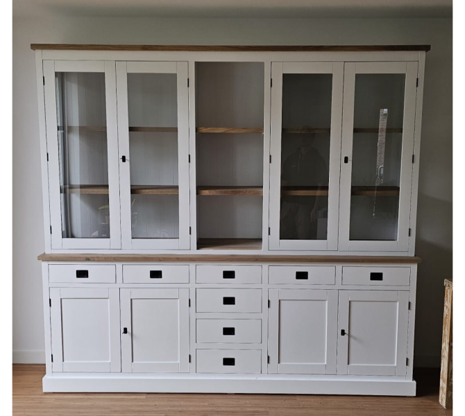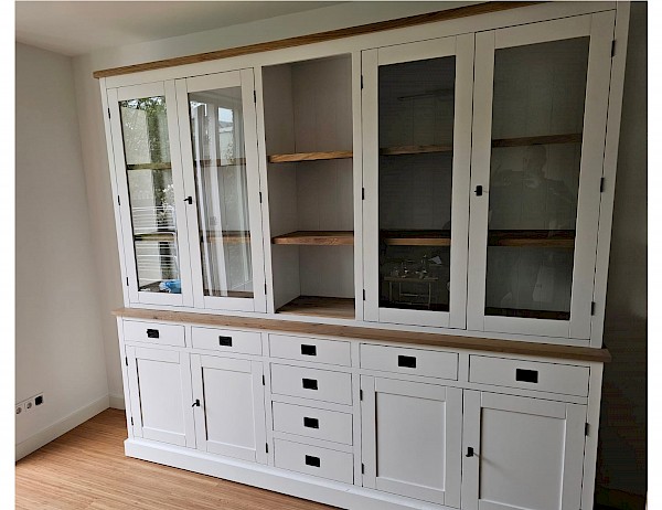 Schitterende buffetkast met een verrassende indeling. Genoeg ruimte om leuke dingen te etaleren, maar ook meer dan genoeg bergruimte achter gesloten kastdeuren in de benedenkast. Deze kast kan in alle RAL-kleuren uitgevoerd worden, ook de optie met of zonder eiken details. Hoogwaardige afwerking door o.a. softclosing op de lades. Het is ook mogelijk om bijv komgreepjes op de lades te monteren ipv trekgreepjes. Ook door zijglas extra ruimtelijk, maar kan ook met dichte zijpanelen uitgevoerd worden.