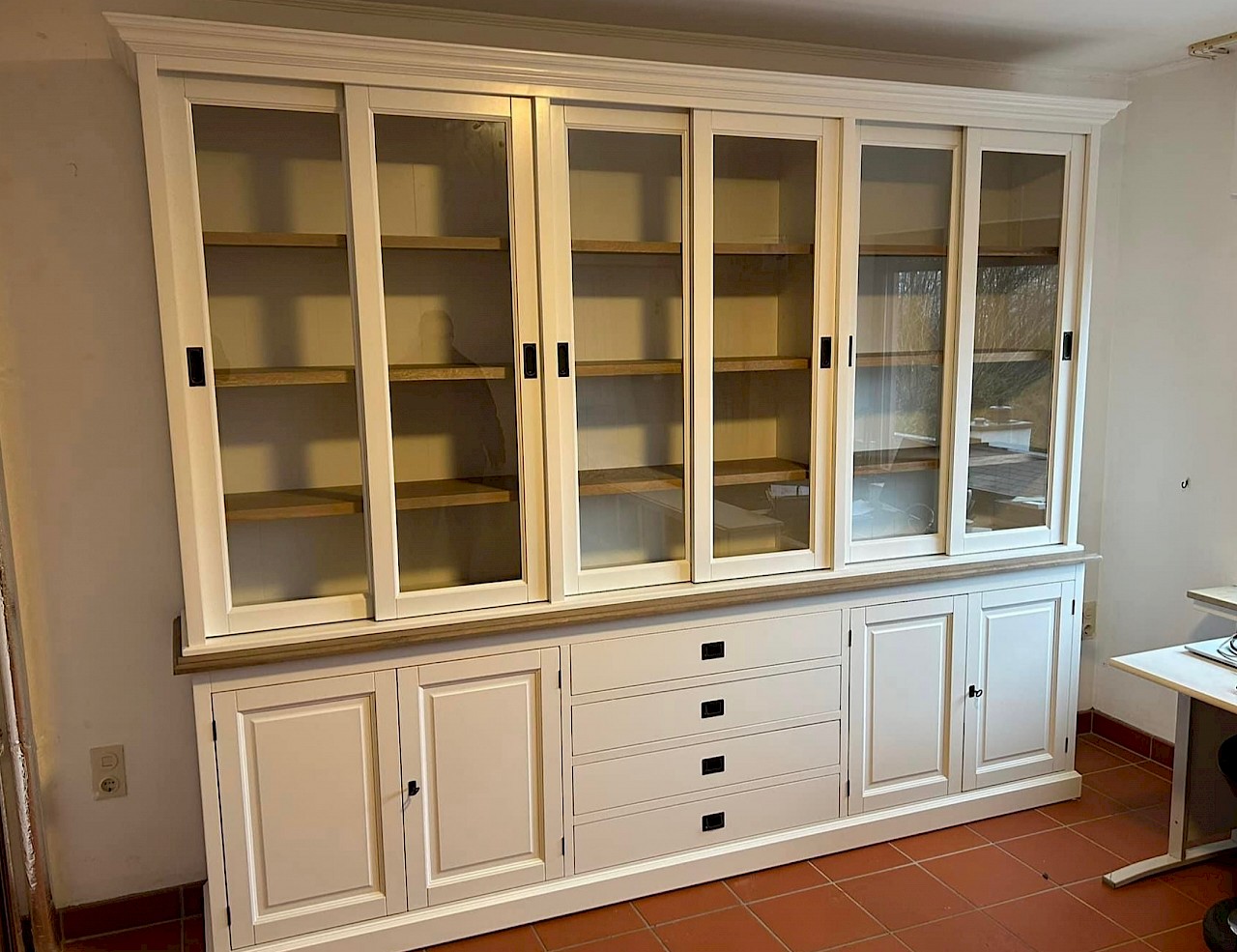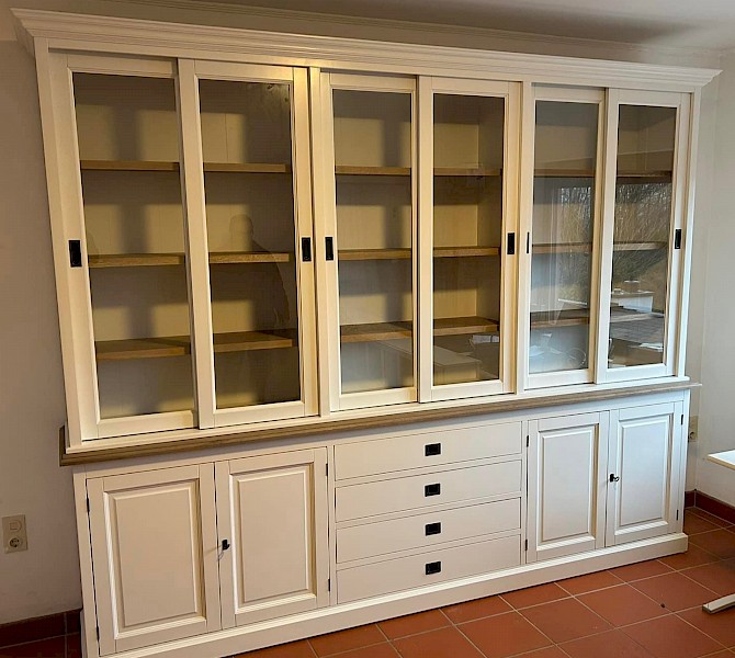 Deze prachtige white wash buffetkast kan de blikvanger zijn in uw woonruimte! Een tijdloze uitstraling waardoor deze zowel in een modern als klassiek interieur past. De kast bevat 4 schuifdeuren boven daarnaast een aantal lades. Vervaardiging is uitgevoerd met hoge kwaliteit, waardoor lades schuiven op geleiders (SOFT-CLOSING) en deuren schuiven op een rails. Deze mooie kast bestaat uit 2 gedeeltes. Hoogte 240 cm, breedte 300 cm. De schappen en zetplank zijn van gerookt eiken gemaakt, waardoor er een prachtig warm effect ontstaat. Unieke combinatie.