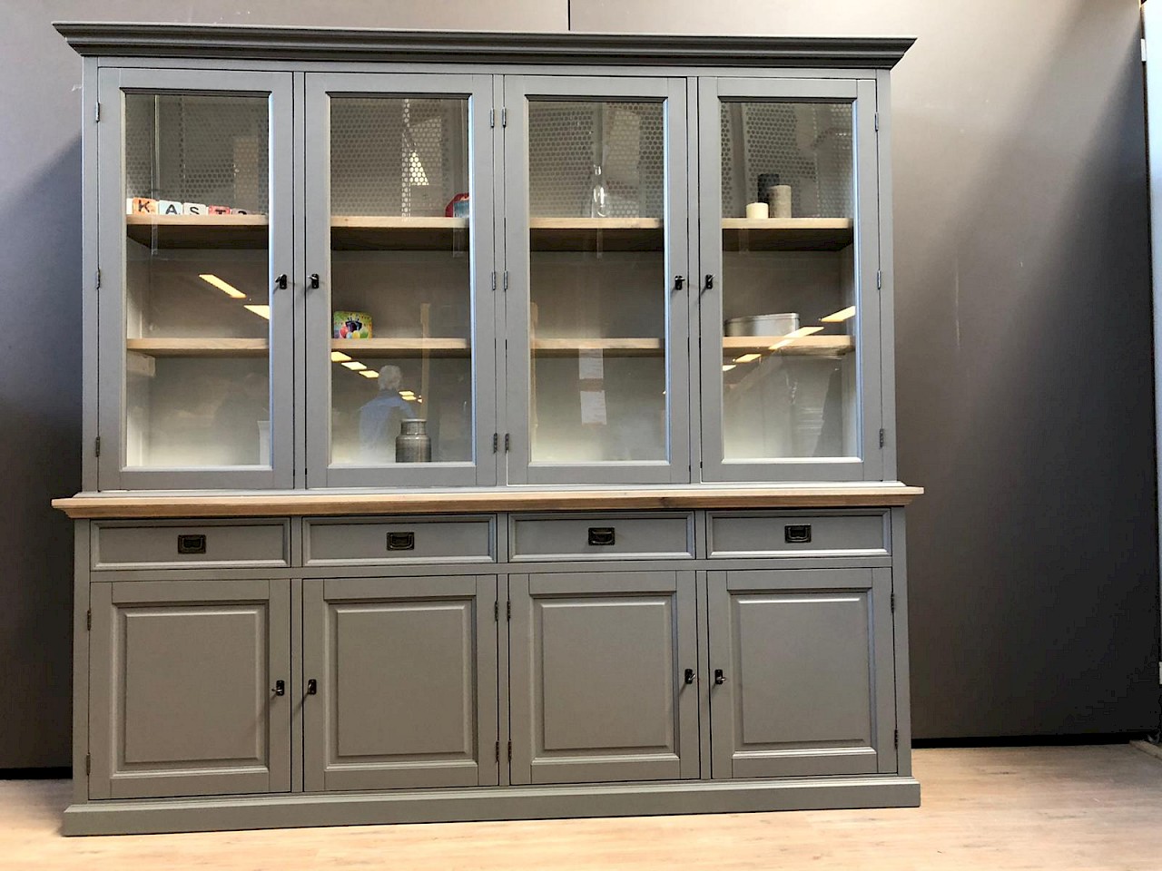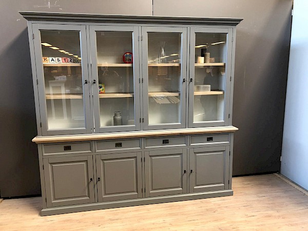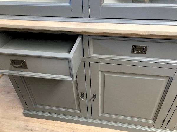 Deze compacte buffetkast beschikt over een goede opbergruimte door de diepte van de onder- en bovenkast. De buffetkast London 240 is gemaakt van oud grenen hout afgewerkt met gerookt eiken. De afwerking is glad gespoten, lades lopen op softclosing. Kwalitatief echt hoogwaardig afgewerkt. Deze kast bestaat uit 2 delen.