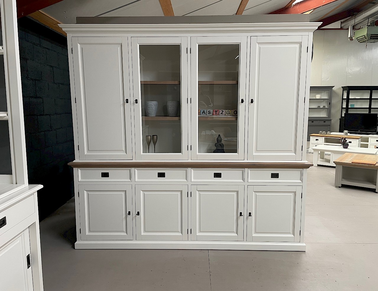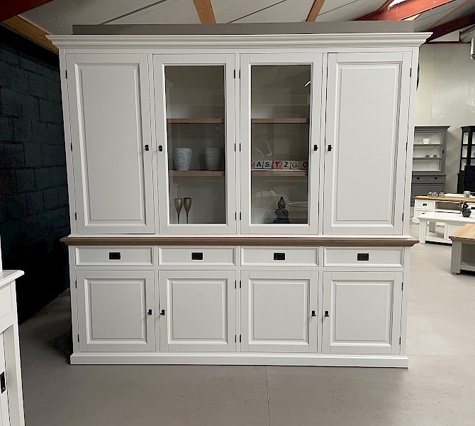 Deze compacte buffetkast beschikt over een goede opbergruimte door de diepte van de onder- en bovenkast. De buffetkast London wit/eiken 240 is gemaakt van oud grenen hout afgewerkt met gerookt eiken. De afwerking is glad gespoten, lades lopen op softclosing. Kwalitatief echt hoogwaardig afgewerkt. Deze kast bestaat uit 2 delen.