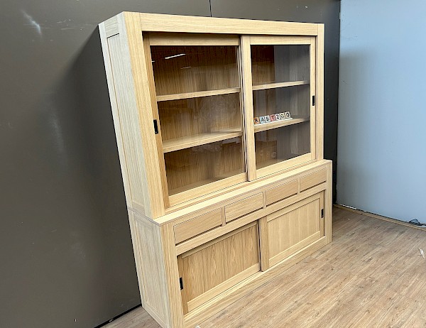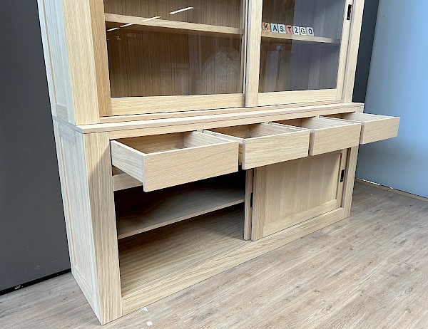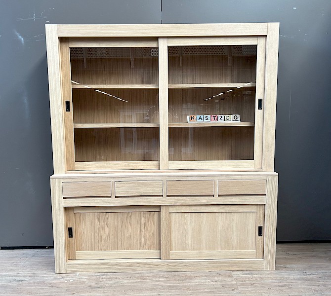 Deze strakke buffetkast is combinatie met massief eiken en eiken vineer uitgevoerd, kwalitatief hoogwaardig afgewerkt, dat echt een massieve uitstraling heeft. Uiteraard bestaat de kast uit 2 gedeeltes en daardoor makkelijk in vervoer. Dit model Mees is ook in andere afmetingen verkrijgbaar, van 100cm tot 300cm breed. Ook in hoogtes kan gevarieerd worden van 180 naar 260cm. De onderkast is ook als losse dressoir te gebruiken. Er zijn ook andere varianten eiken verkrijgbaar, white wash eiken, grey wash eiken, donker eiken, etc... Vraag ons naar de mogelijkheden!