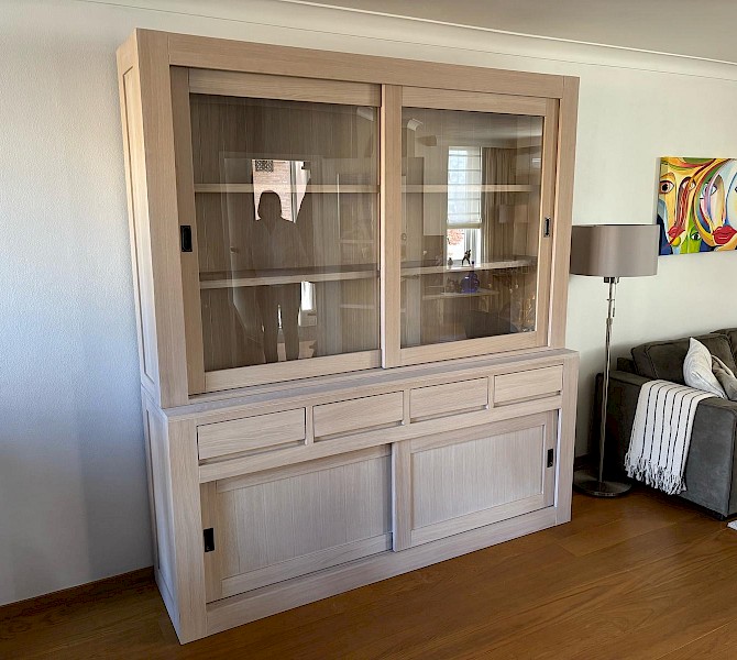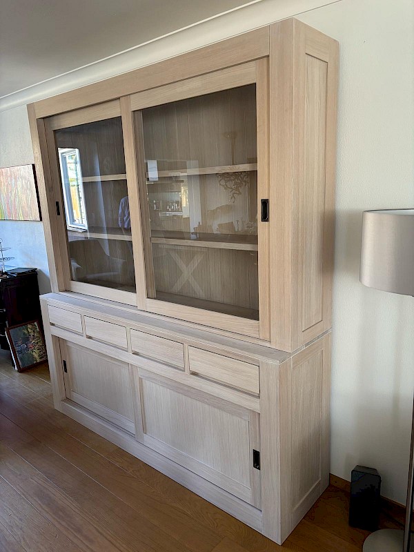 Deze strakke buffetkast is combinatie met massief eiken en eiken vineer uitgevoerd, kwalitatief hoogwaardig afgewerkt, dat echt een massieve uitstraling heeft. Uiteraard bestaat de kast uit 2 gedeeltes en daardoor makkelijk in vervoer. Dit model Mees is ook in andere afmetingen verkrijgbaar, van 100cm tot 300cm breed. Ook in hoogtes kan gevarieerd worden van 180 naar 260cm. De onderkast is ook als losse dressoir te gebruiken. Er zijn ook andere varianten eiken verkrijgbaar, white wash eiken, grey wash eiken, donker eiken, etc... Vraag ons naar de mogelijkheden!