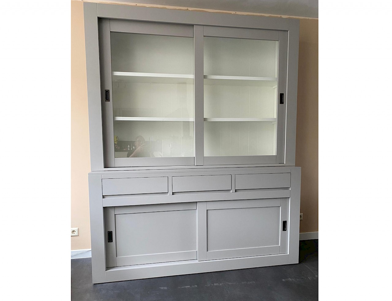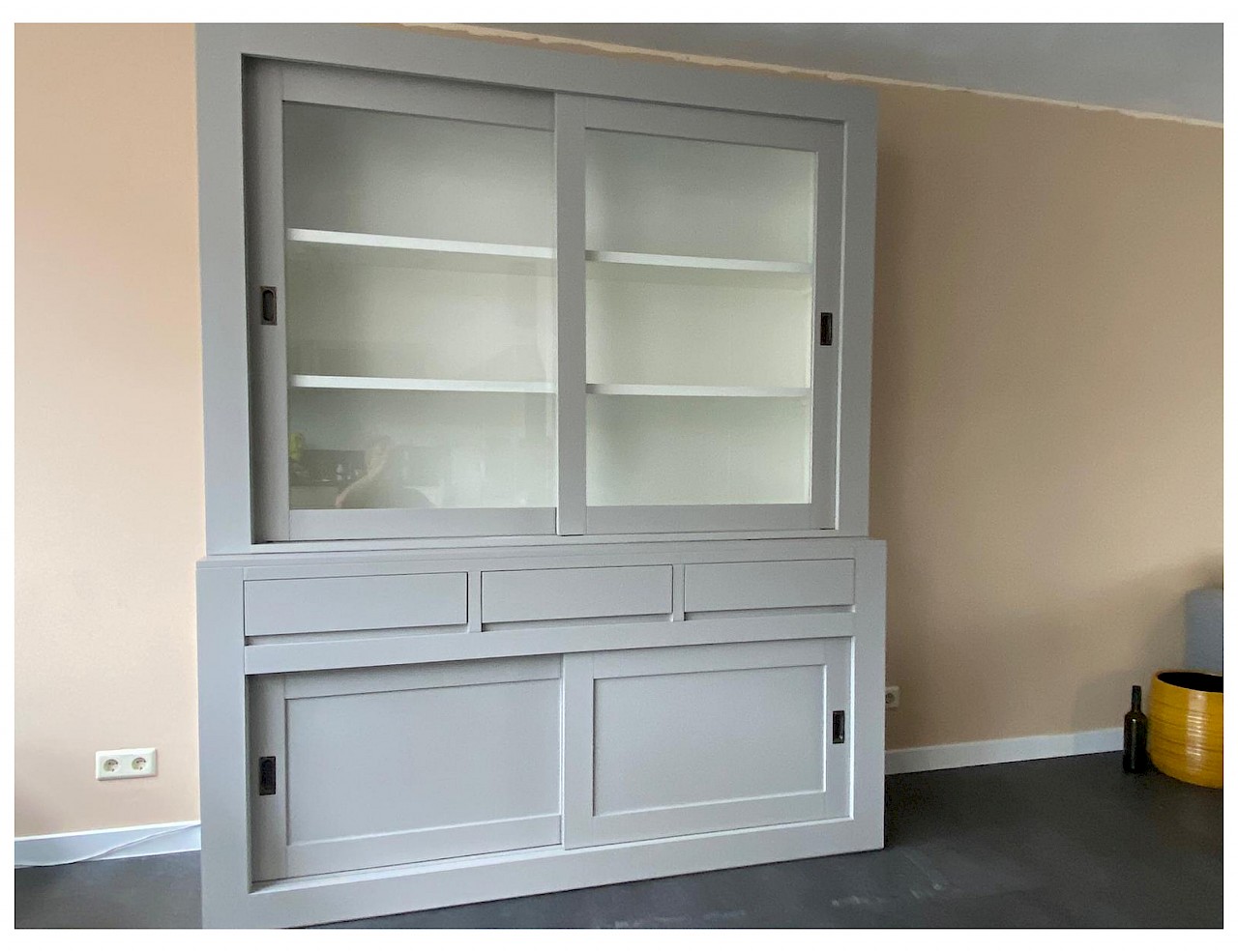 De schuifdeuren hangen in aluminium rails, glijden vloeiend en zweven als het ware.Op de lades is soft closing geinstalleerd,dus echt die luxe.