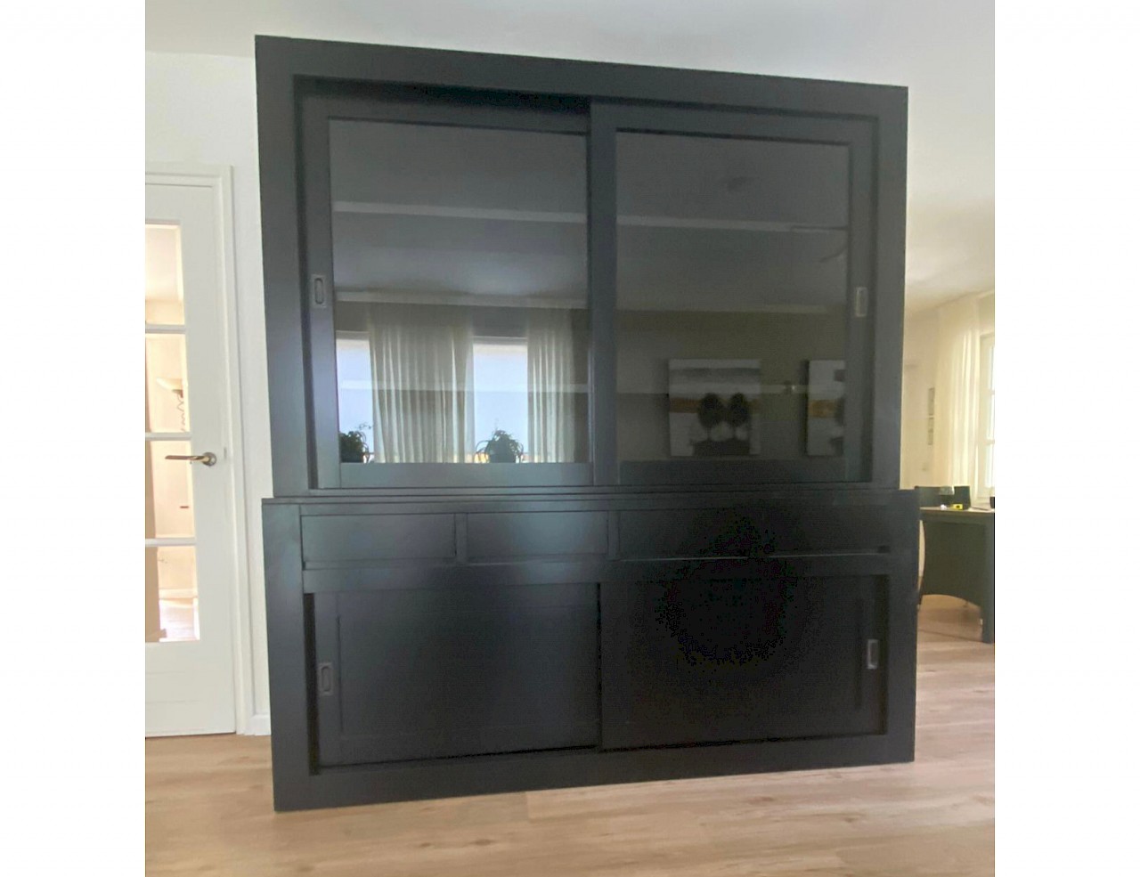 De schuifdeuren hangen in aluminium rails, glijden vloeiend en zweven als het ware.Op de lades is soft closing geinstalleerd,dus echt die luxe.