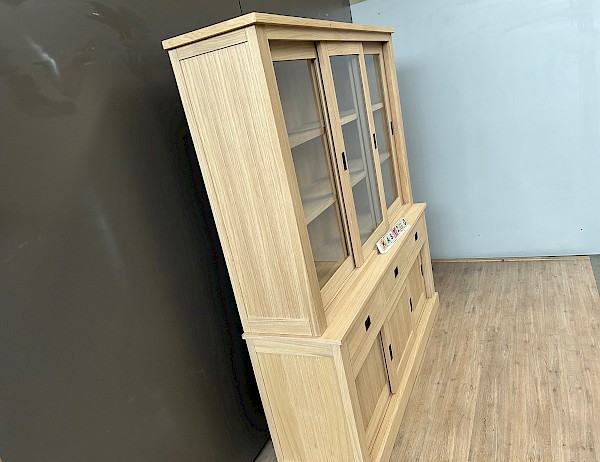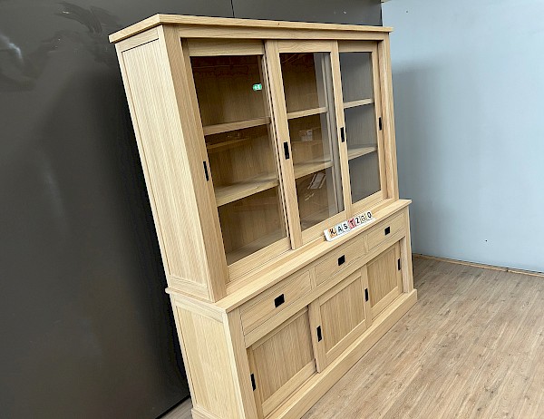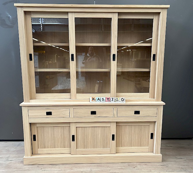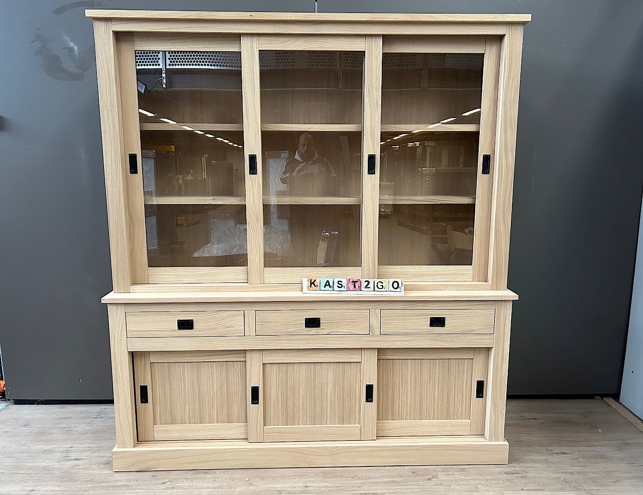 Deze strakke buffetkast is combinatie met massief eiken en eiken vineer uitgevoerd, dat echt een massieve uitstraling heeft. Uiteraard bestaat de kast uit 2 gedeeltes en daardoor makkelijk in vervoer. Dit model Melbourne is ook in andere afmetingen verkrijgbaar, van 100cm tot 300cm breed. Ook in hoogtes kan gevarieerd worden van 100 naar 300cm. De onderkast is ook als losse dressoir te gebruiken. Er zijn ook andere varianten eiken verkrijgbaar, white wash eiken, grey wash eiken, donker eiken, etc... Bekijk de fotogalarij voor andere kleurenmonsters.