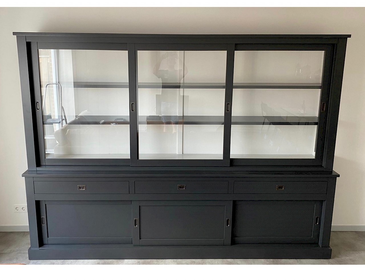 De schuifdeuren hangen in aluminium rails, glijden vloeiend en zweven als het ware.Op de lades is soft closing geinstalleerd,dus echt die luxe.