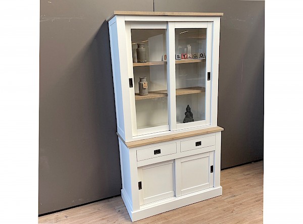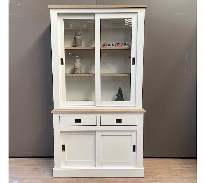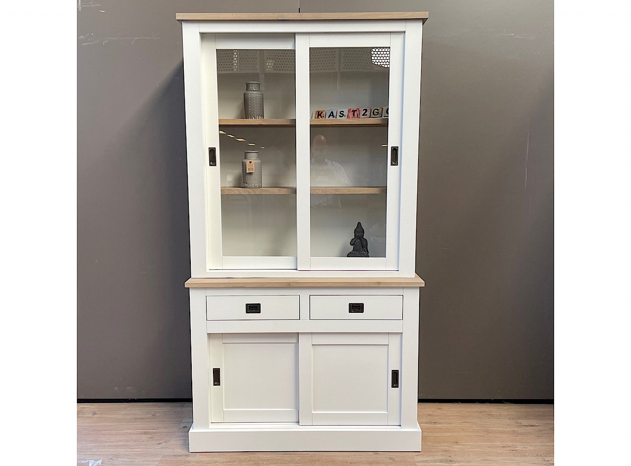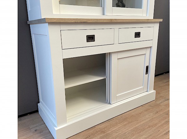 Deze aantrekkelijke glad gespoten kast biedt veel opbergruimte voor items die je onzichtbaar zou willen in de onderkast, en je kunt je persoonlijke bezittingen weergeven in het glazen gedeelte van de buffetkast.