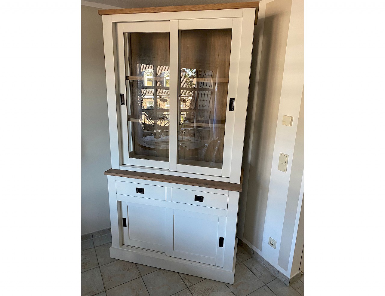 Deze aantrekkelijke glad gespoten kast biedt veel opbergruimte voor items die je onzichtbaar zou willen in de onderkast, en je kunt je persoonlijke bezittingen weergeven in het glazen gedeelte van de buffetkast.
