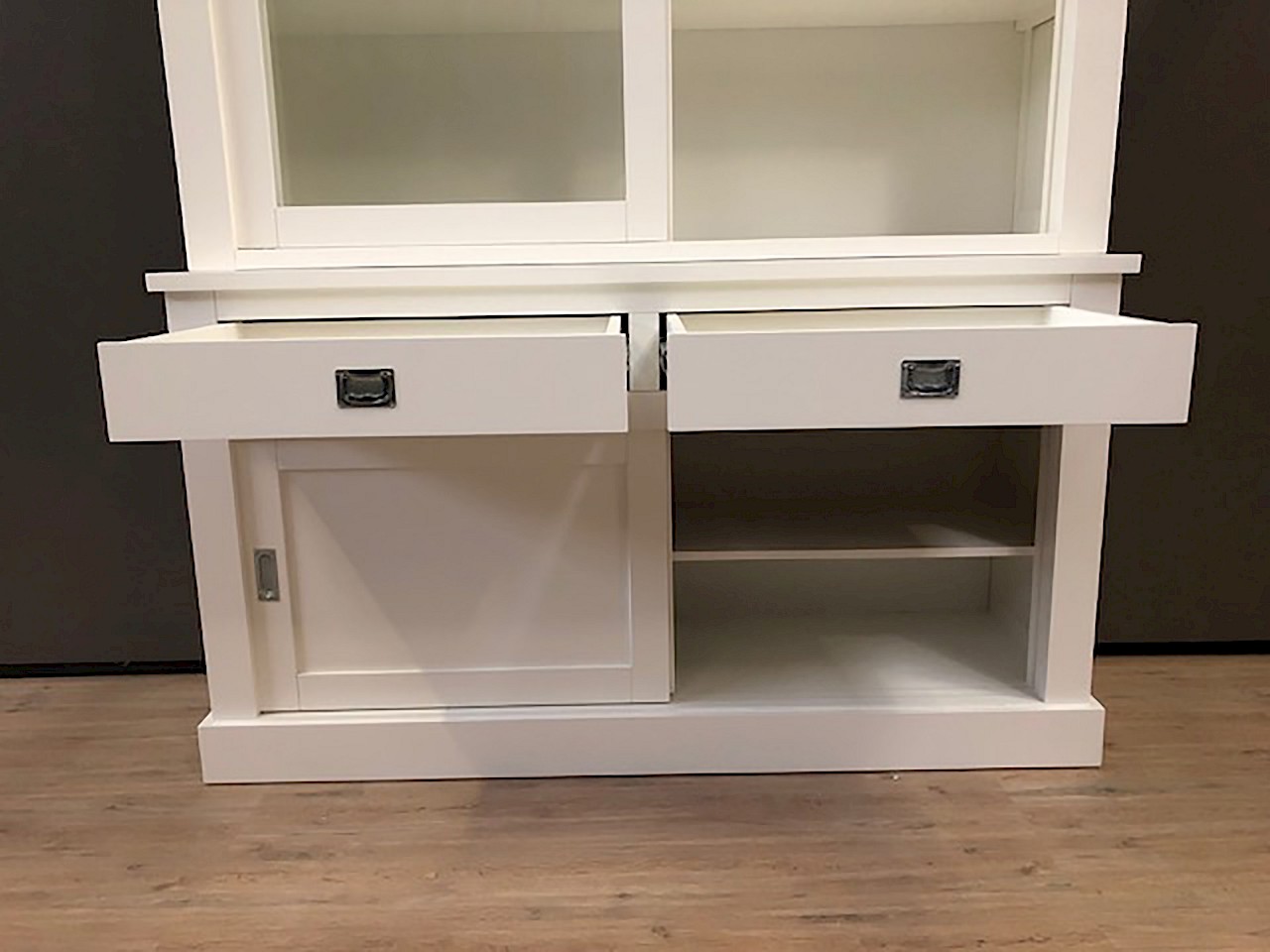 Deze aantrekkelijke glad gespoten kast biedt veel opbergruimte voor items die je onzichtbaar zou willen in de onderkast, en je kunt je persoonlijke bezittingen weergeven in het glazen gedeelte van de buffetkast.
