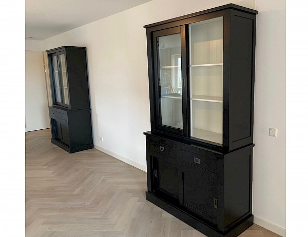De schuifdeuren hangen in aluminium rails, glijden vloeiend en zweven als het ware.Op de lades is soft closing geinstalleerd,dus echt die luxe.