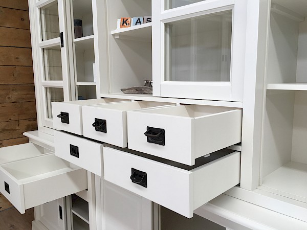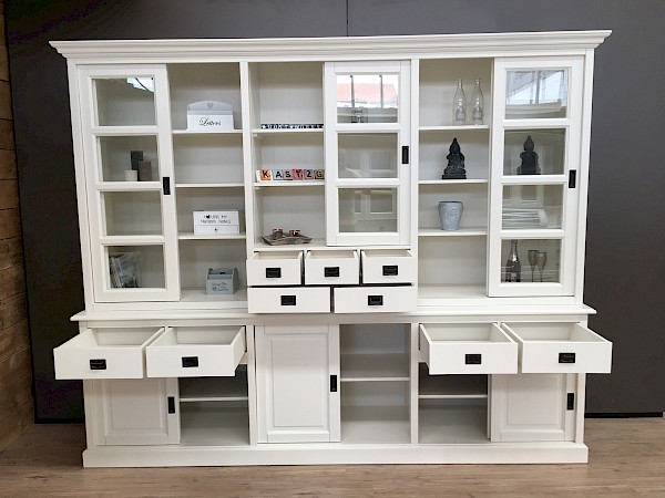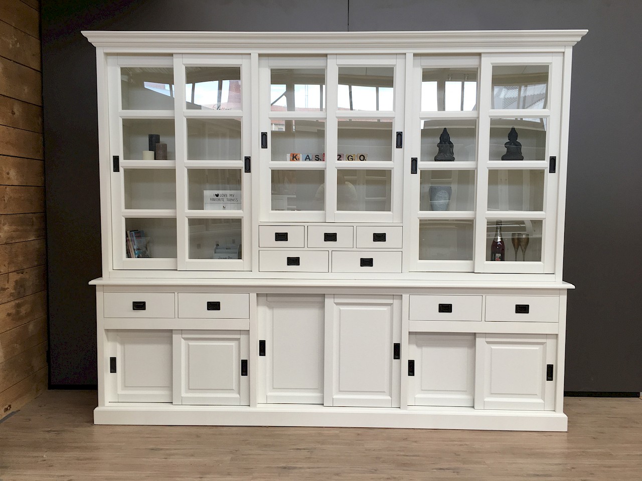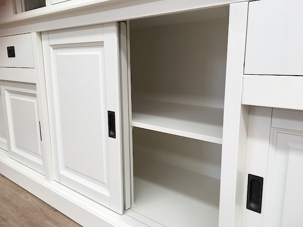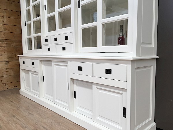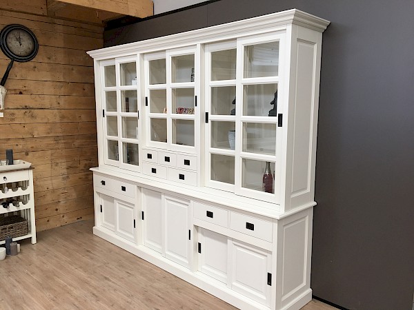 Deze buffetkast MIRA is een sfeervolle landelijke buffetkast. De kast heeft een hoogwaardige afwerking, kenmerkend door onder andere luxe soflclosing op de lades, ijzeren hangrails waardoor de deuren als het ware zweven. De strakke handgrepen zijn zowel in brons als in aluminium uitvoering verkrijgbaar. De plankdiepte boven is 34.5cm en onder zelfs 42.5cm, hierdoor een zee aan bergruimte in deze prachtige kast!