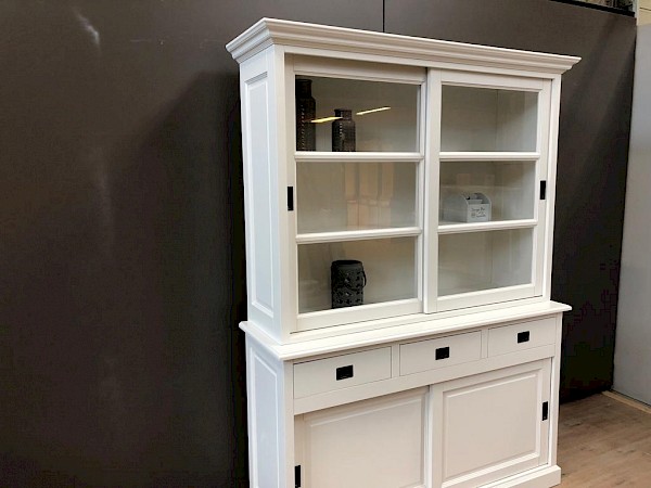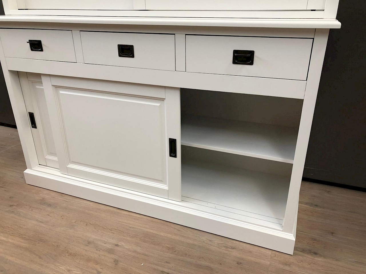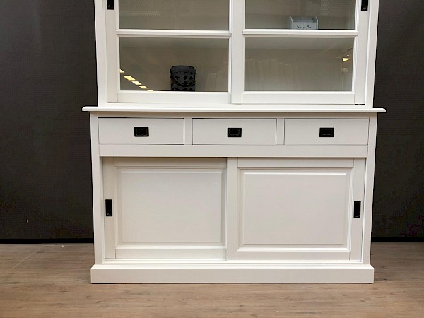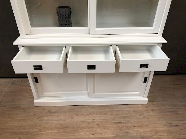 Deze mooi vitrinekast biedt veel opbergruimte voor items die je onzichtbaar zou willen in de onderkast, en je kunt je persoonlijke bezittingen weergeven in het glazen gedeelte van de buffetkast. De schuifdeuren hangen in aluminium rails, glijden vloeiend en zweven als het ware. Op de lades is soft closing geinstalleerd,dus echt die luxe. Kast is dicht aan zijkant in bovenstuk!