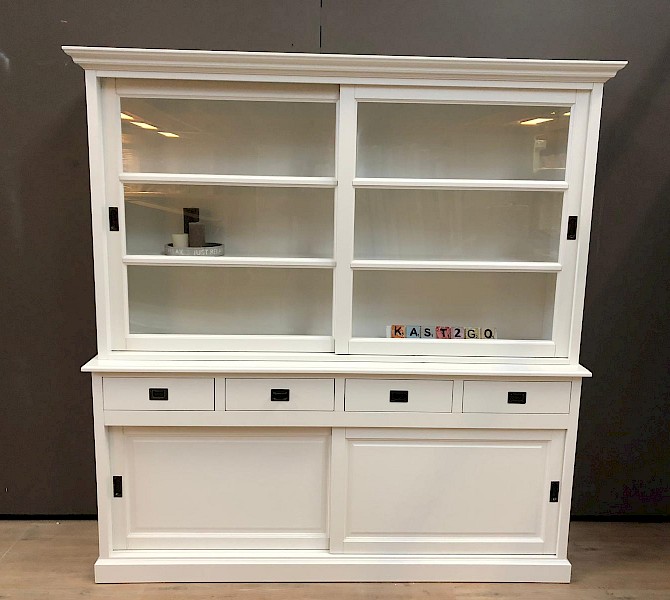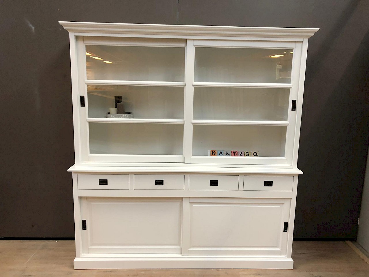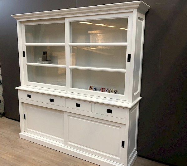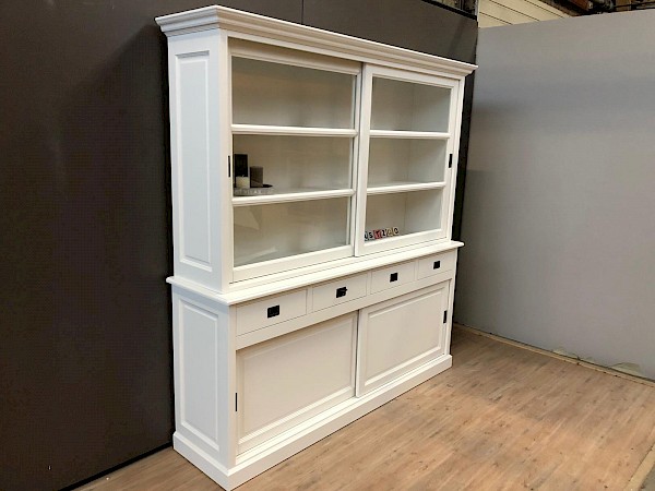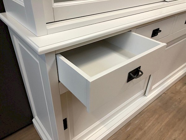 Deze mooi vitrinekast biedt veel opbergruimte voor items die je onzichtbaar zou willen in de onderkast, en je kunt je persoonlijke bezittingen weergeven in het glazen gedeelte van de buffetkast. De schuifdeuren hangen in aluminium rails, glijden vloeiend en zweven als het ware. Op de lades is soft closing geinstalleerd,dus echt die luxe. Kast is dicht aan zijkant in bovenstuk!