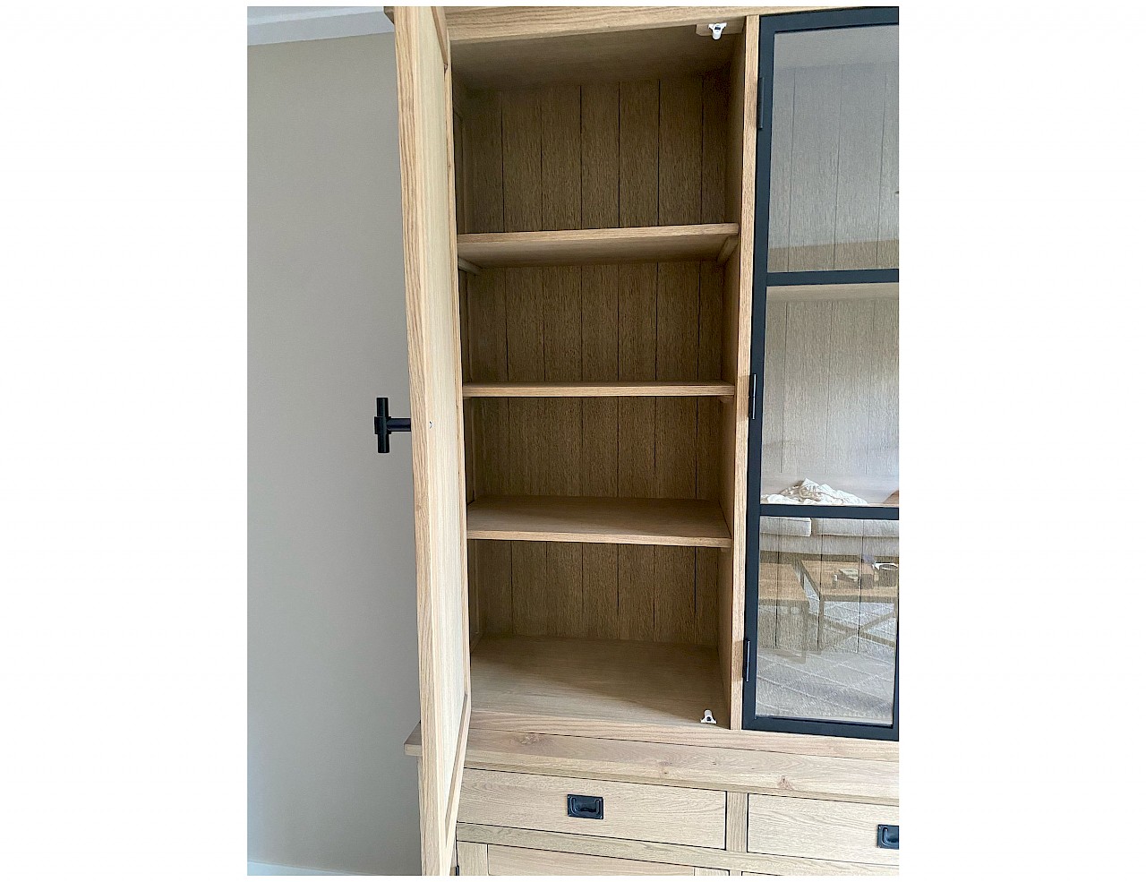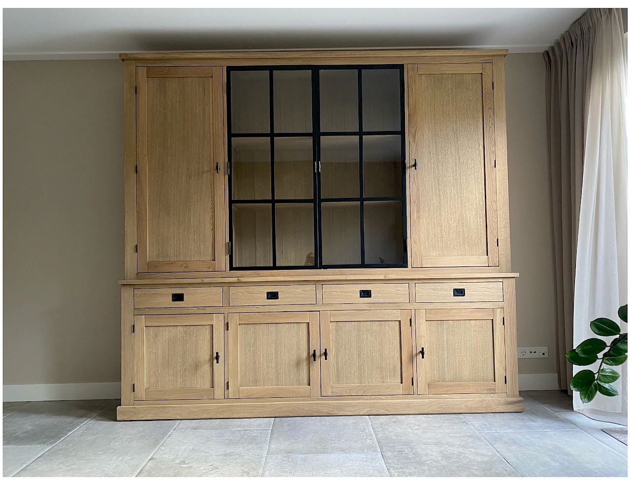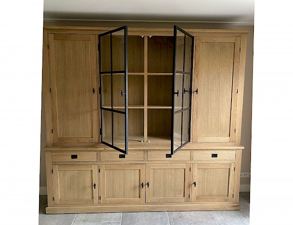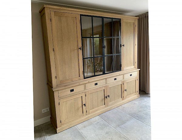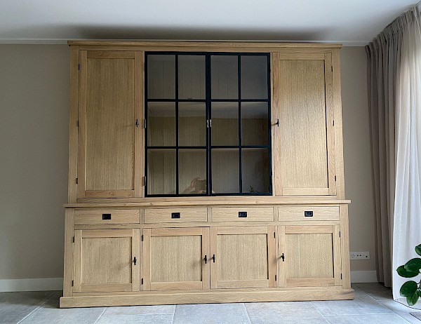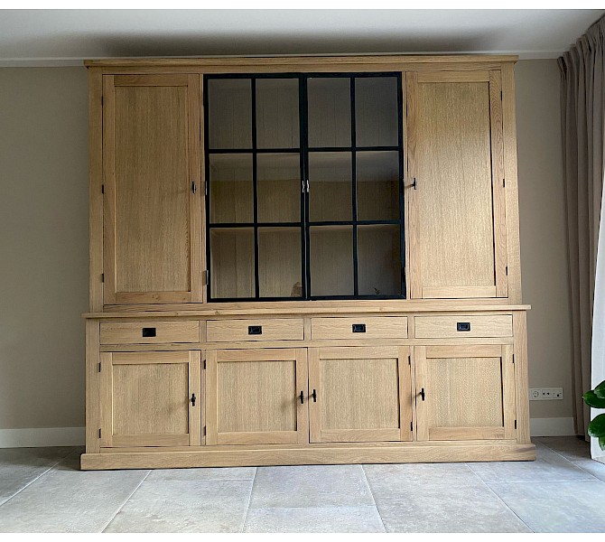 Deze strakke buffetkast is combinatie met massief eiken en eiken vineer uitgevoerd, kwalitatief hoogwaardig afgewerkt, dat echt een massieve uitstraling heeft. Uiteraard bestaat de kast uit 2 gedeeltes en daardoor makkelijk in vervoer. Dit model Suzanne is ook in andere afmetingen verkrijgbaar, van 100cm tot 300cm breed. Ook in hoogtes kan gevarieerd worden van 100 naar 300cm. De onderkast is ook als losse dressoir te gebruiken. Er zijn ook andere varianten eiken verkrijgbaar, white wash eiken, grey wash eiken, donker eiken, etc... Bekijk de fotogalarij voor andere kleurenmonsters.