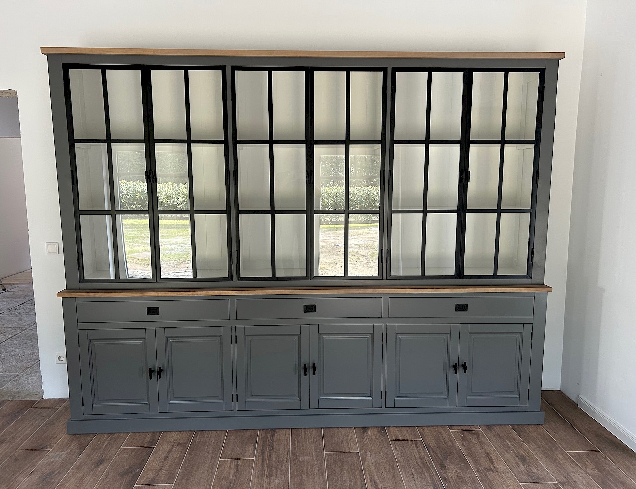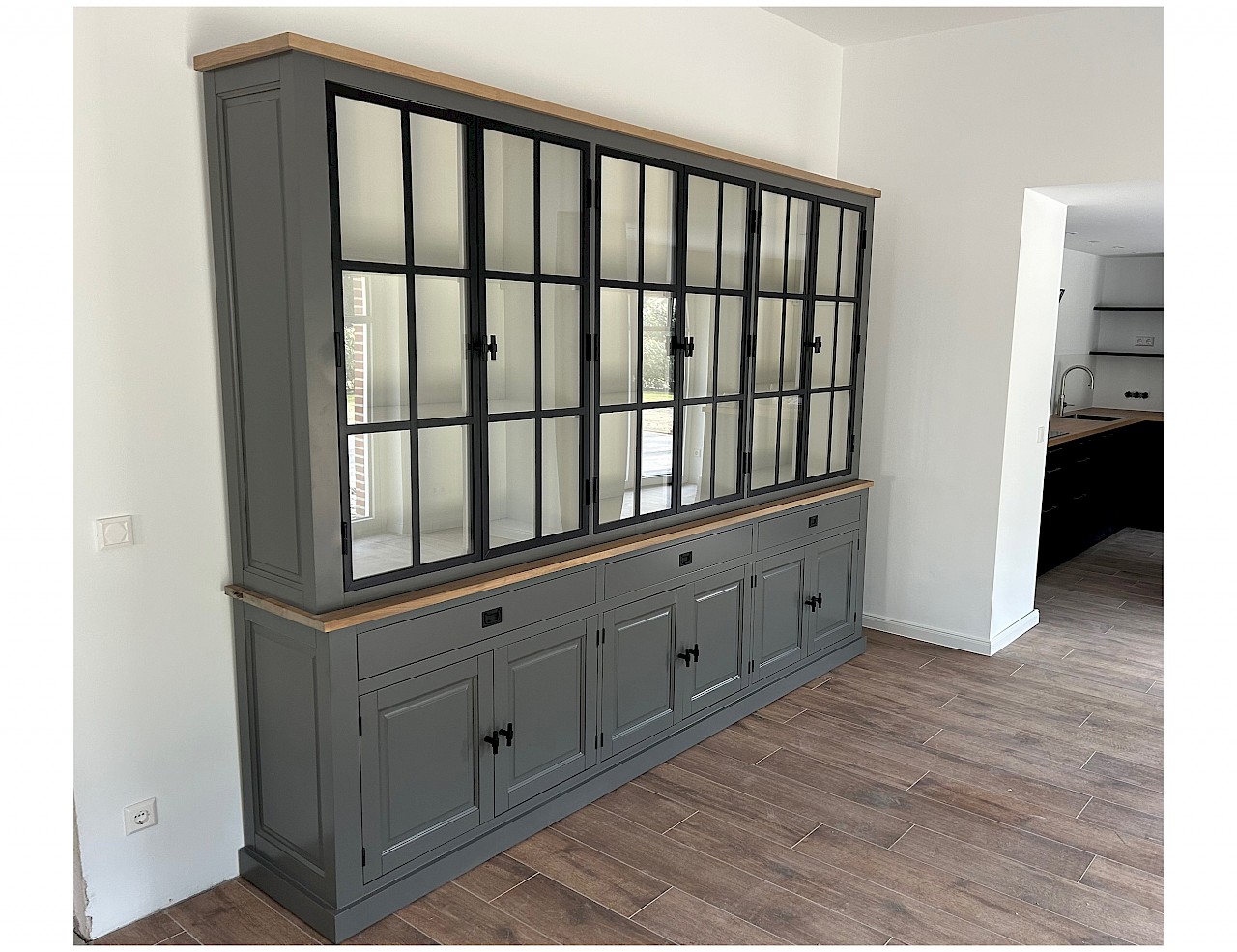 Buffetkast met metalen deuren. De inductriele look door gebruik van 3 metalen deuren is gelukt, de strakke uitstraling blijft aanwezig!