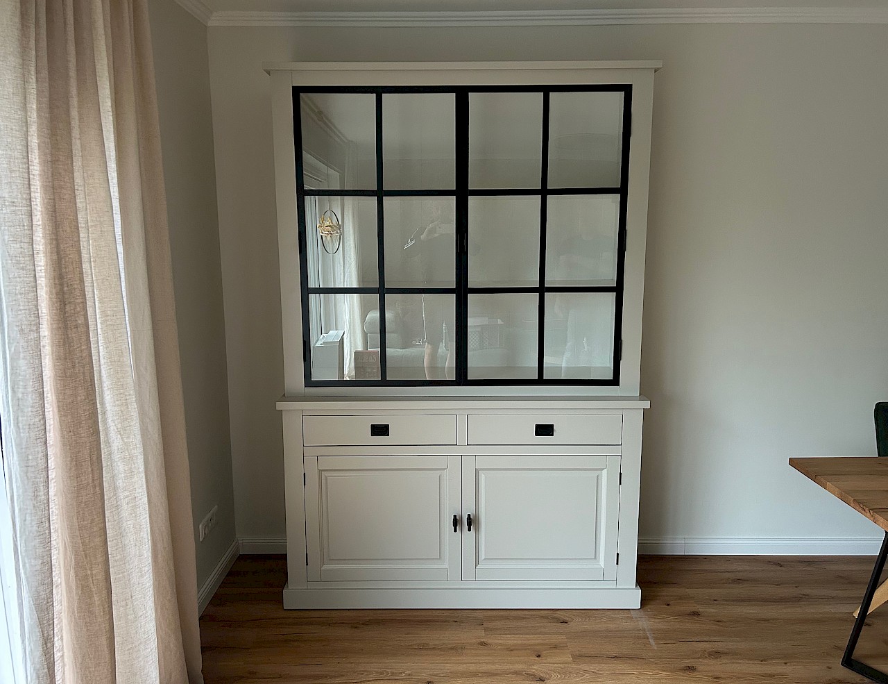 Buffetkast met metalen deuren. De inductriele look door gebruik van 2 metalen deuren is gelukt, de strakke uitstraling blijft aanwezig!