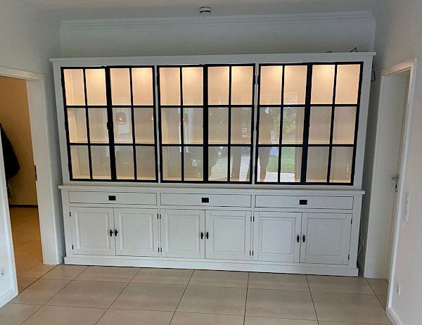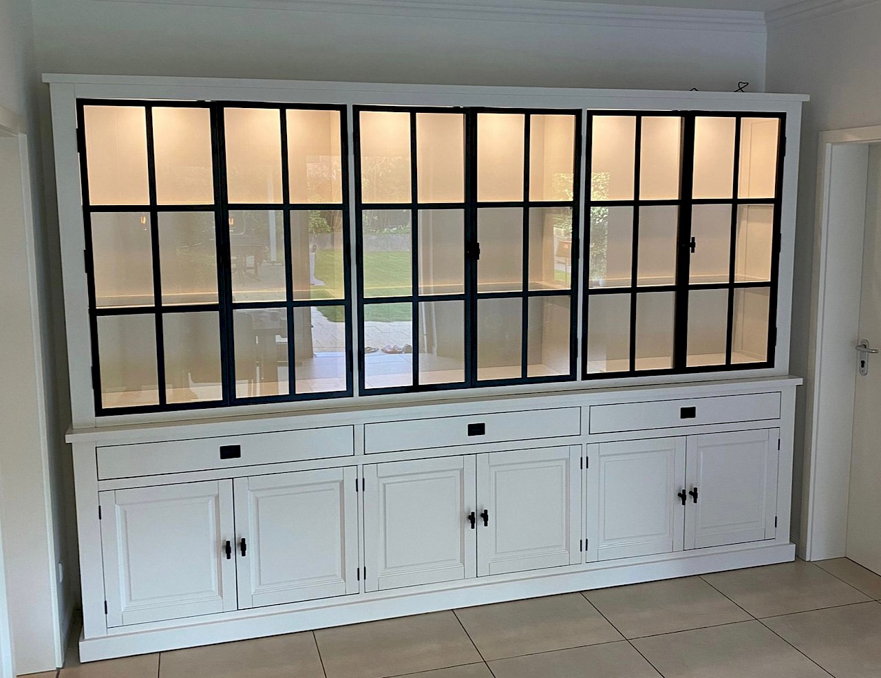 Buffetkast met metalen deuren. De inductriele look door gebruik van 3x2 metalen deuren is gelukt, de strakke uitstraling blijft aanwezig!