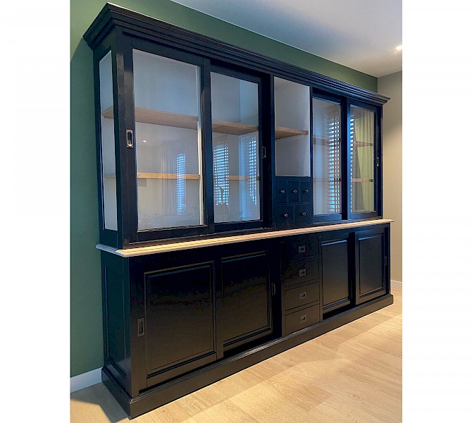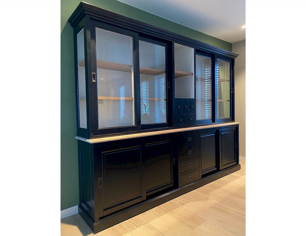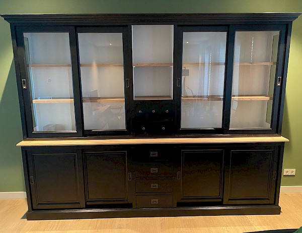 Schitterende buffetkast met een verrassende indeling. Genoeg ruimte om leuke dingen te etaleren, maar ook meer dan genoeg bergruimte achter gesloten kastdeuren in de benedenkast. Deze kast kan in alle RAL-kleuren uitgevoerd worden, ook de optie met of zonder eiken details. Hoogwaardige afwerking door o.a. softclosing op de lades. Het is ook mogelijk om bijv komgreepjes op de lades te monteren ipv trekgreepjes. Ook door zijglas extra ruimtelijk, maar kan ook met dichte zijpanelen uitgevoerd worden.