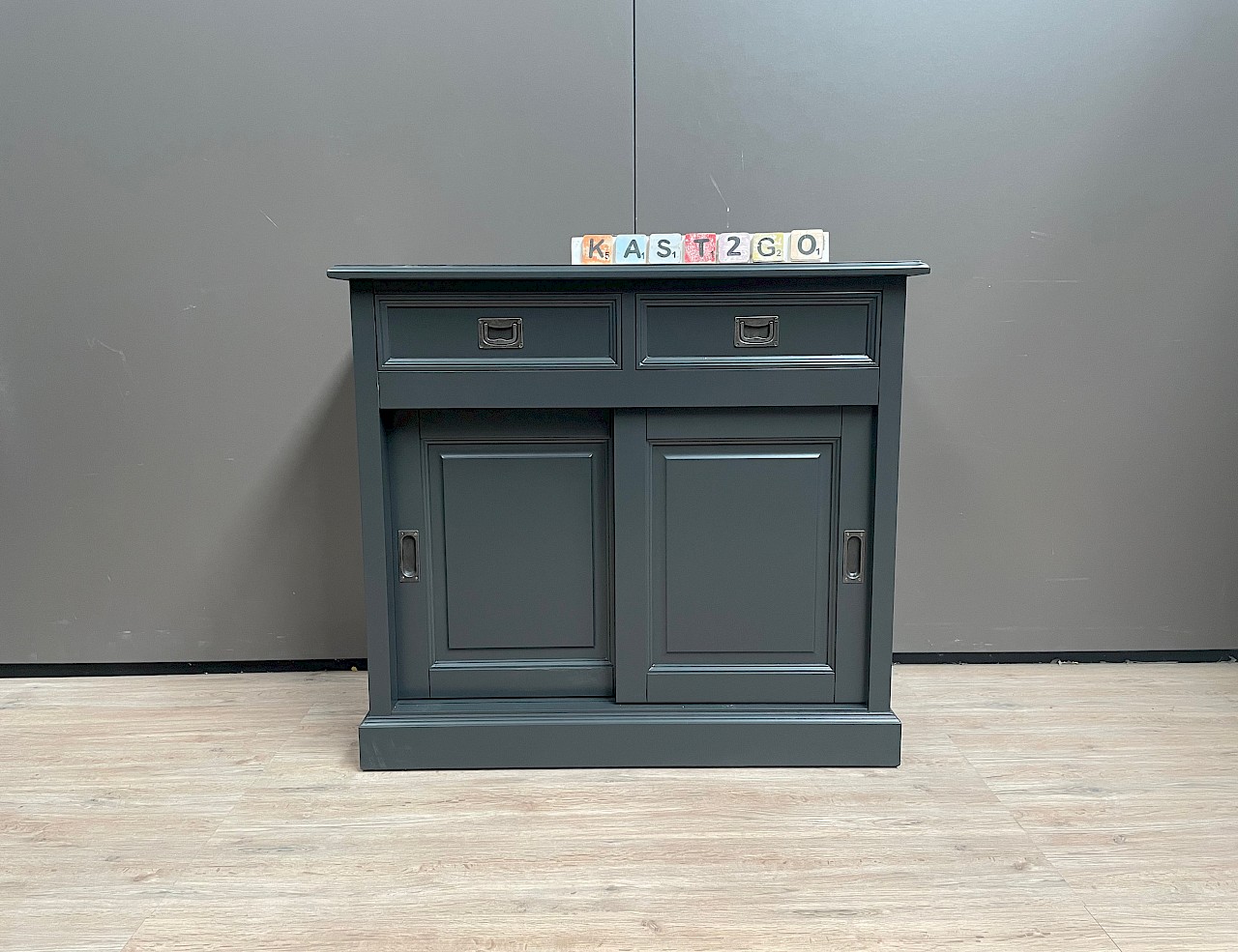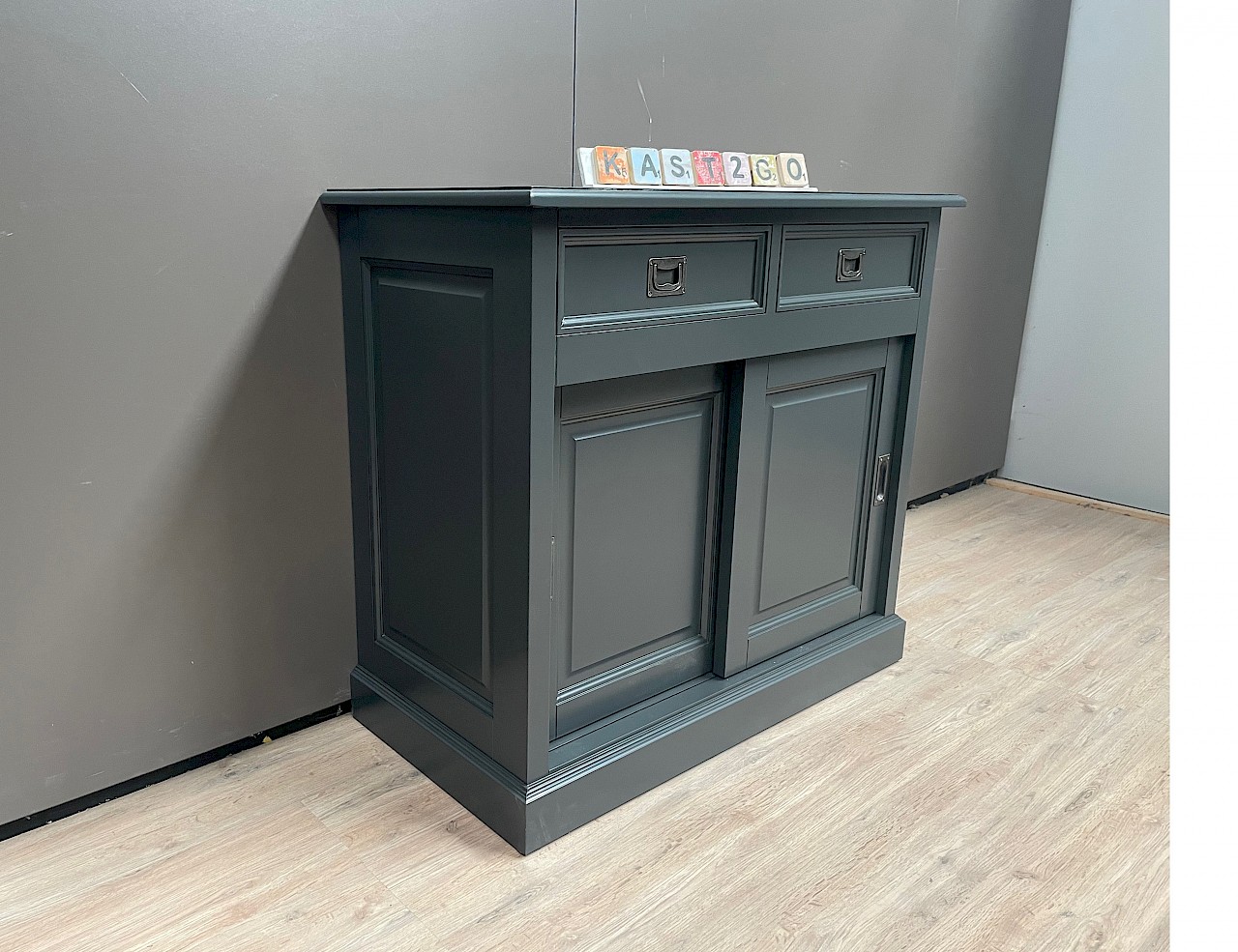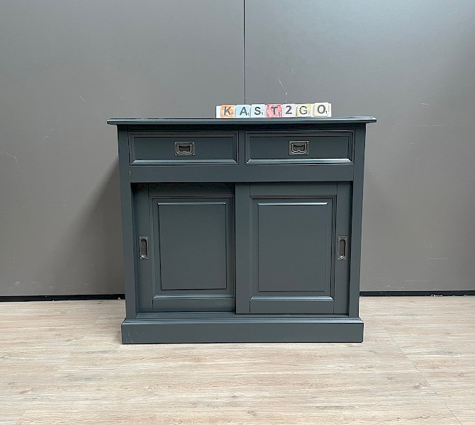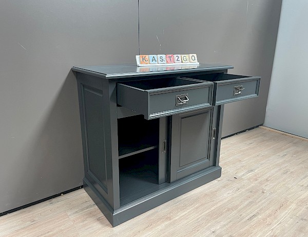 Deze dressoir is heeft een strakke look. Bevat lades, waar soft closing is op geinstaleerd. De deurtjes hangen in metalen rails en gaan erg soepel. Ipv grijs kan deze dressoir kan ook in alle RAL-kleuren gespoten worden. Ook in deze lijn in een kast ,tv meubel of salontafel te koop, kijk verder op onze site en vind de juiste combinatie.