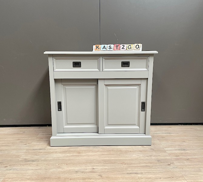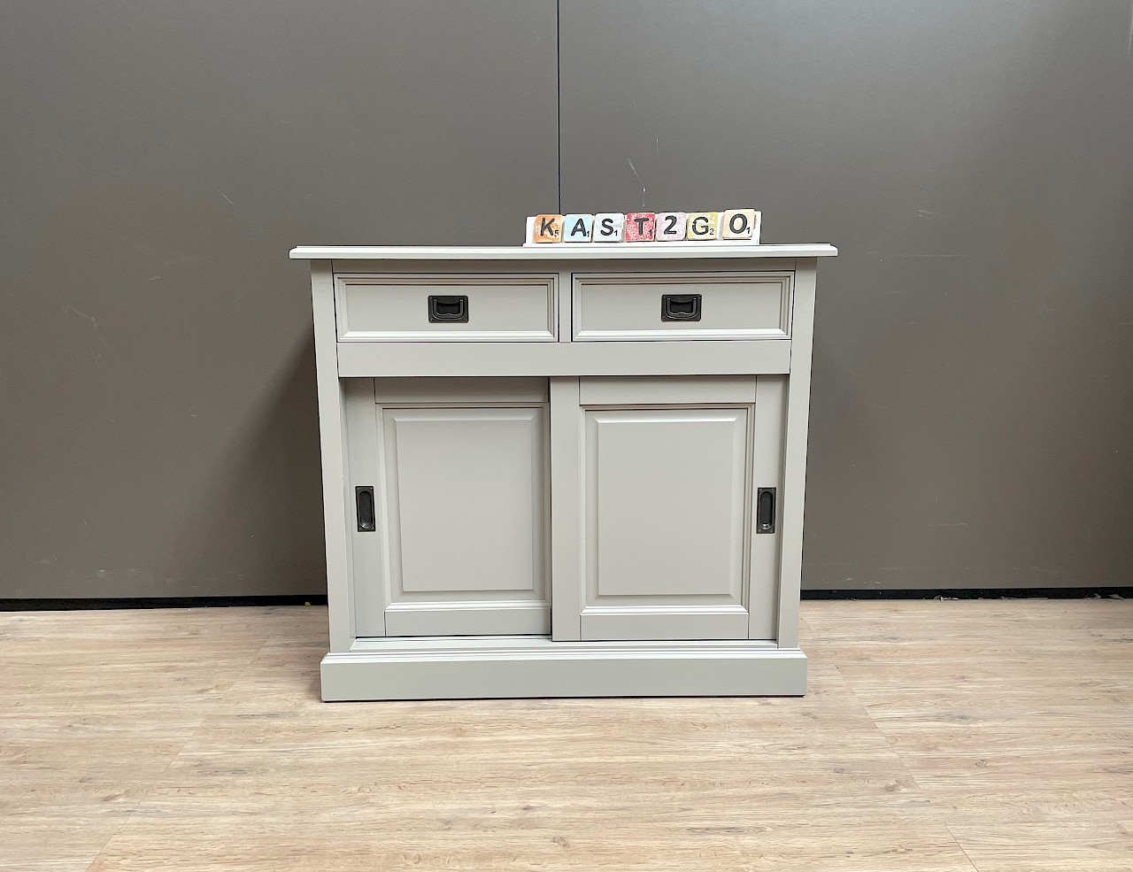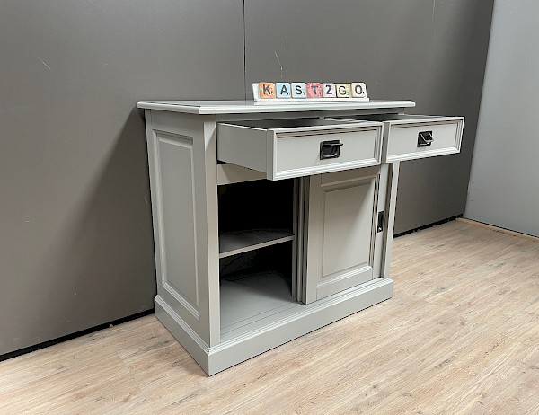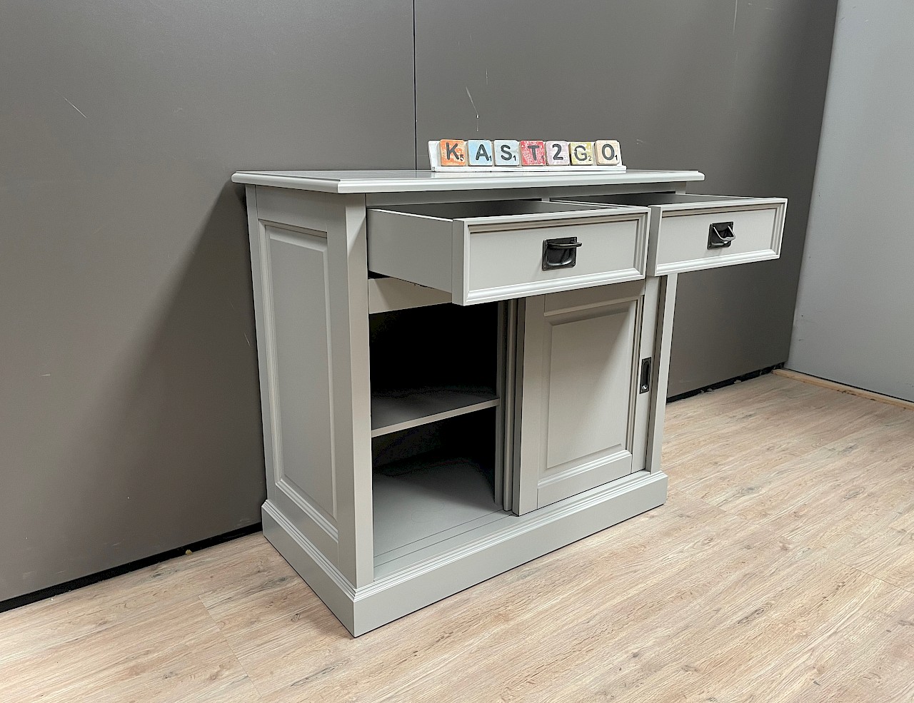 Deze dressoir is heeft een strakke look. Bevat lades, waar soft closing is op geinstaleerd. De deurtjes hangen in metalen rails en gaan erg soepel. Ipv grijs kan deze dressoir kan ook in alle RAL-kleuren gespoten worden. Ook in deze lijn in een kast ,tv meubel of salontafel te koop, kijk verder op onze site en vind de juiste combinatie.