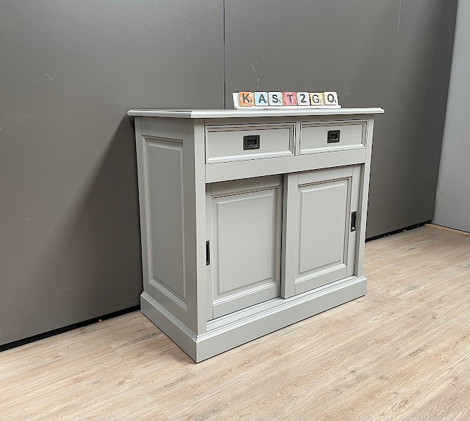 Deze dressoir is heeft een strakke look. Bevat lades, waar soft closing is op geinstaleerd. De deurtjes hangen in metalen rails en gaan erg soepel. Ipv grijs kan deze dressoir kan ook in alle RAL-kleuren gespoten worden. Ook in deze lijn in een kast ,tv meubel of salontafel te koop, kijk verder op onze site en vind de juiste combinatie.