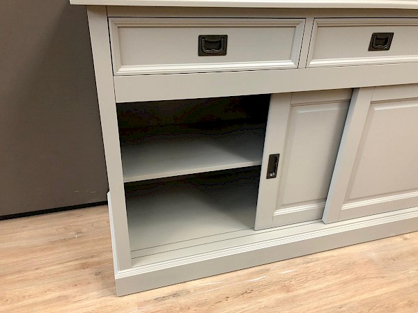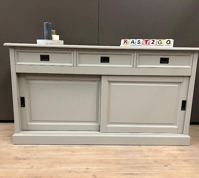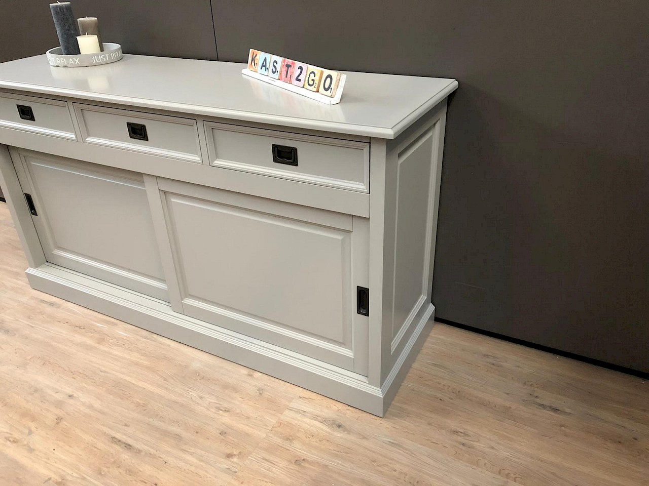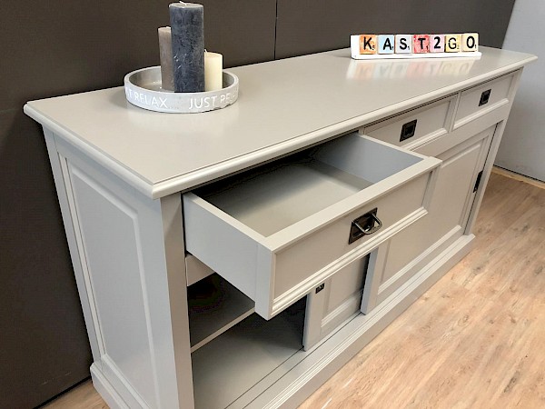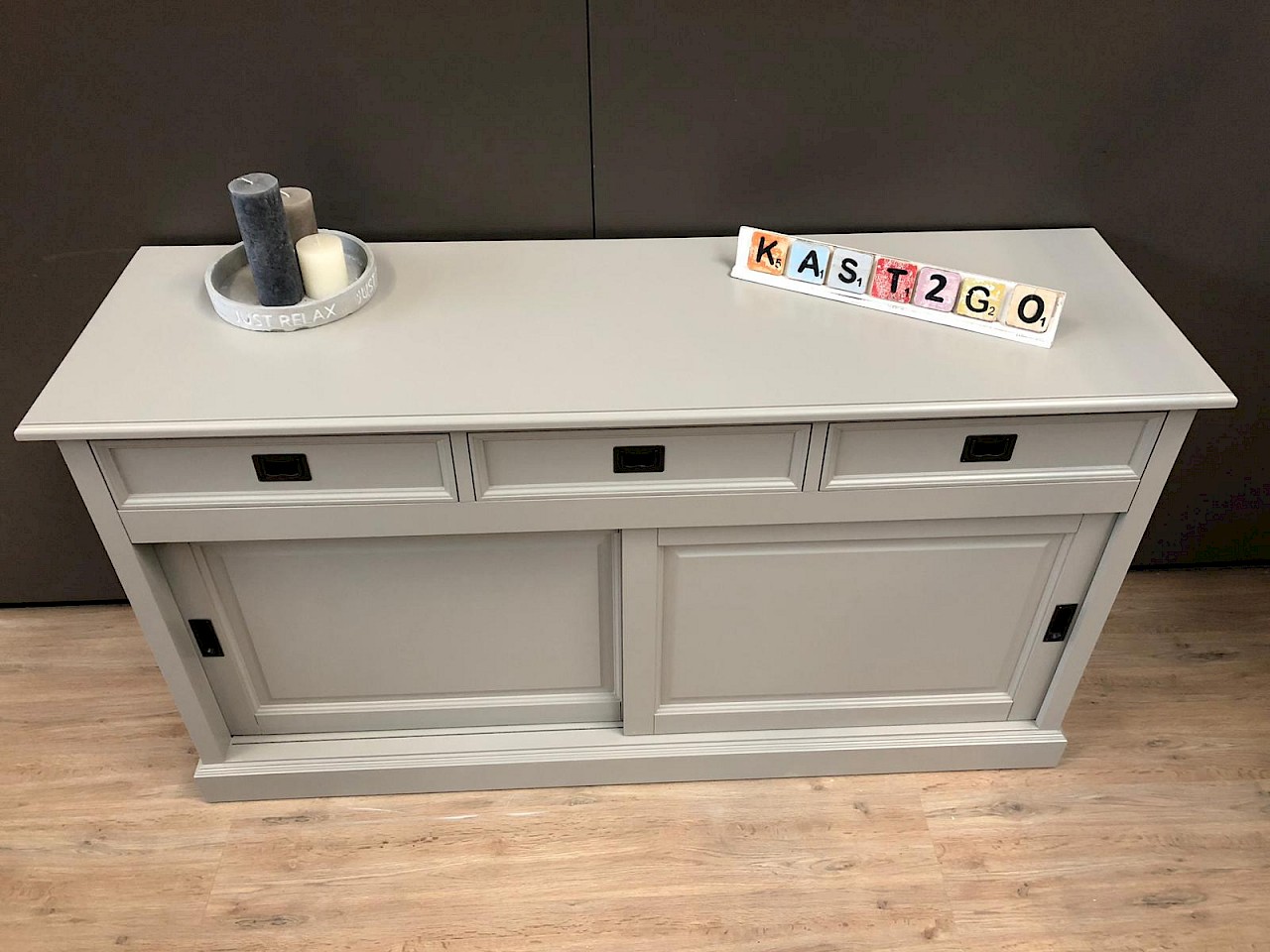 Deze dressoir is heeft een strakke look. Bevat 3 lades, waar soft closing is op geinstaleerd. De deurtjes hangen in metalen rails en gaan erg soepel. Ipv grijs kan deze dressoir kan ook in kleur wit, murano, zwart, verona en antraciet gespoten worden. ook in deze lijn in een kast ,tv meubel of salontafel te koop, kijk verder op onze site en vind de juiste combinatie.
