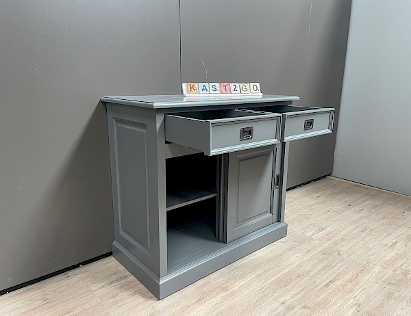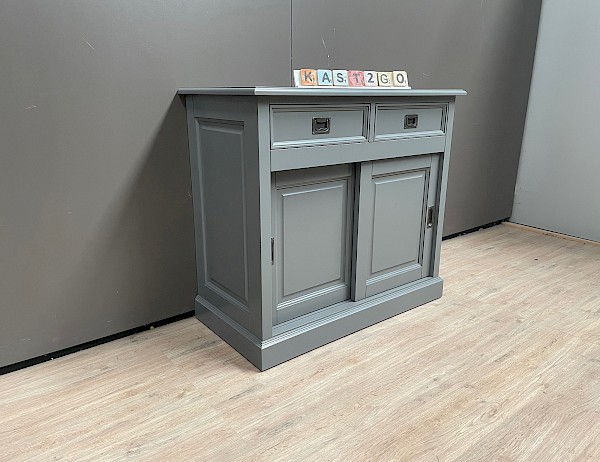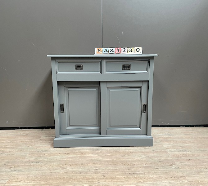 Deze dressoir is heeft een strakke look. Bevat lades, waar soft closing is op geinstaleerd. De deurtjes hangen in metalen rails en gaan erg soepel. Ipv grijs kan deze dressoir kan ook in alle RAL-kleuren gespoten worden. Ook in deze lijn in een kast ,tv meubel of salontafel te koop, kijk verder op onze site en vind de juiste combinatie.