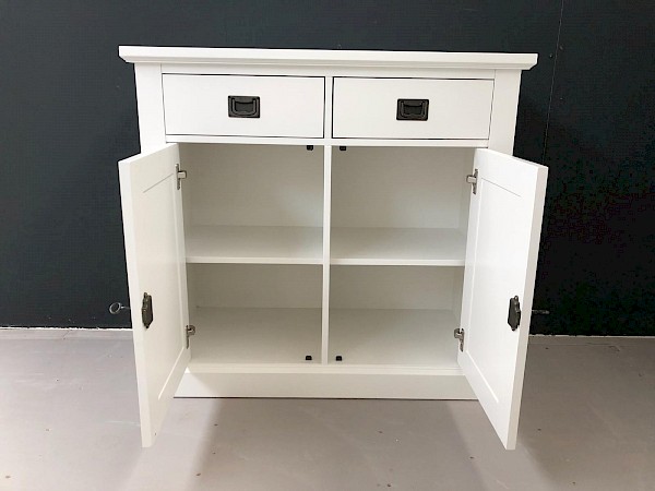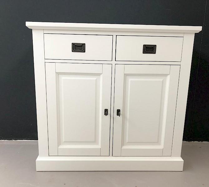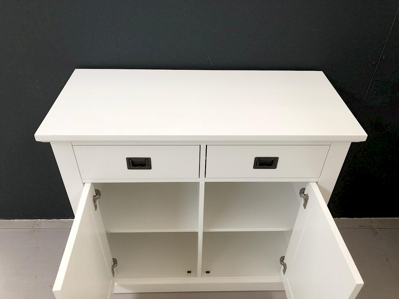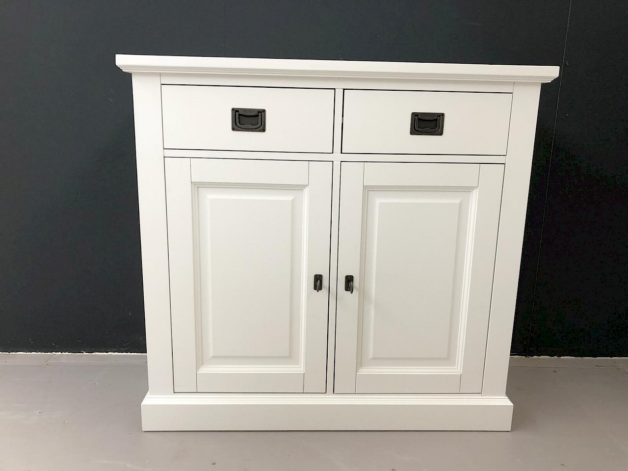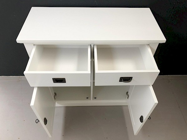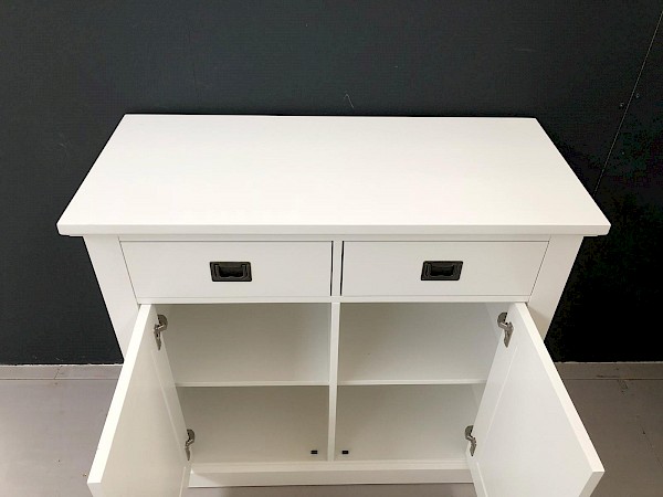 Leuke smallere dressoir van 95 cm, 2 deurtjes, 2 lades en wit bovenblad.
