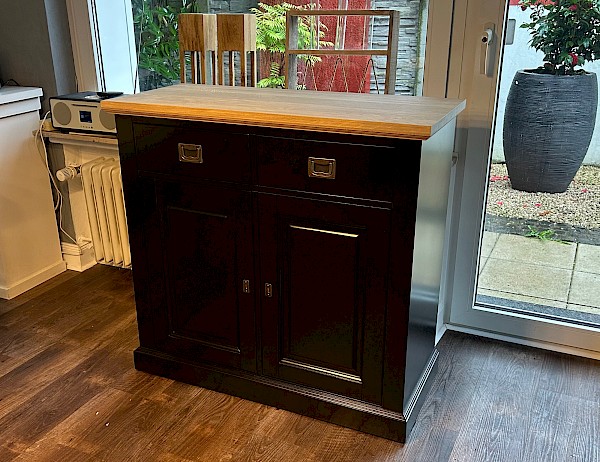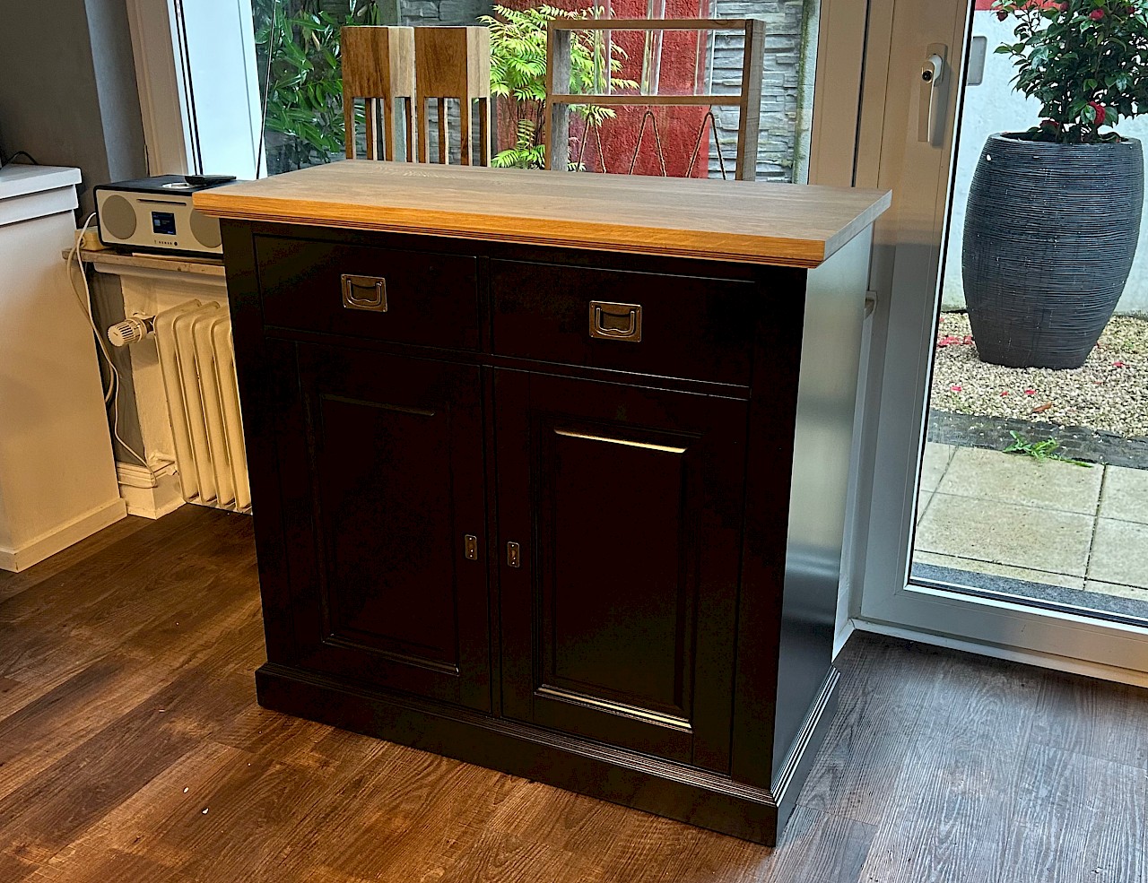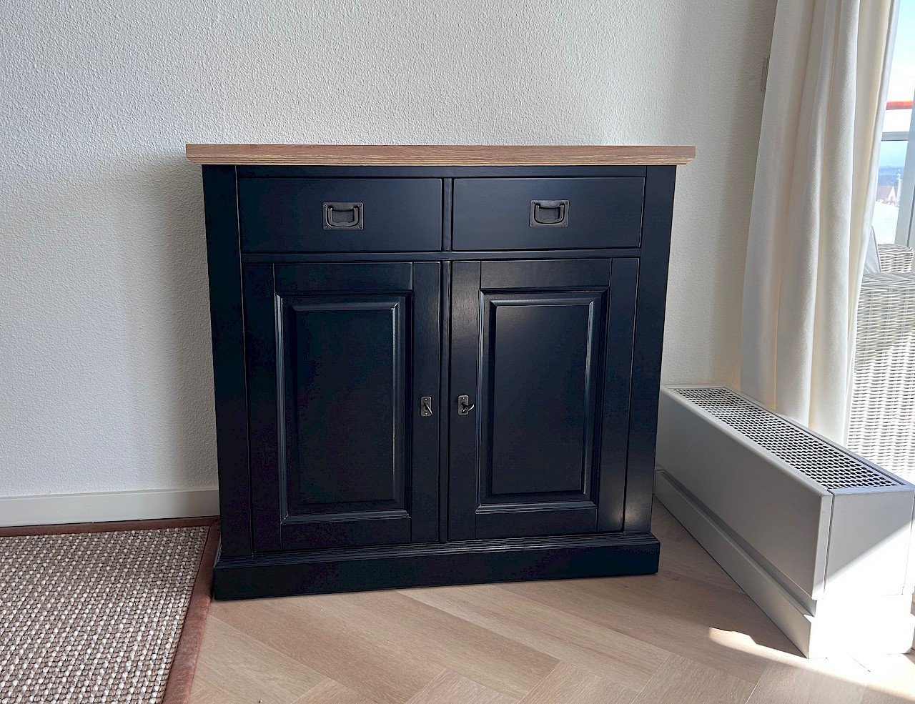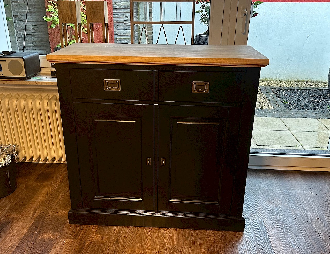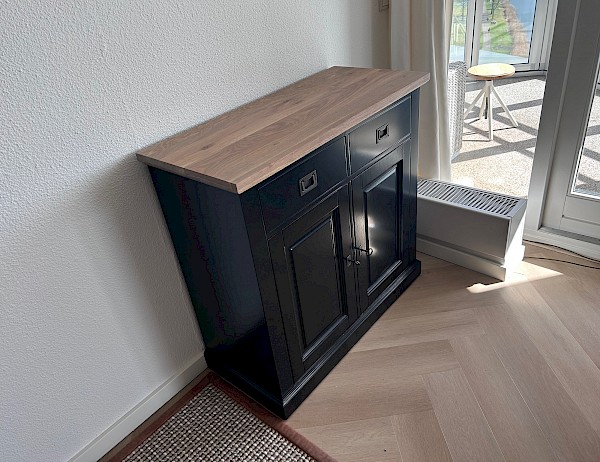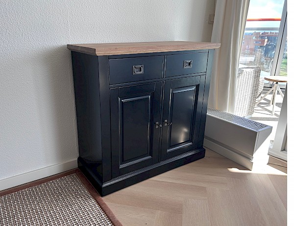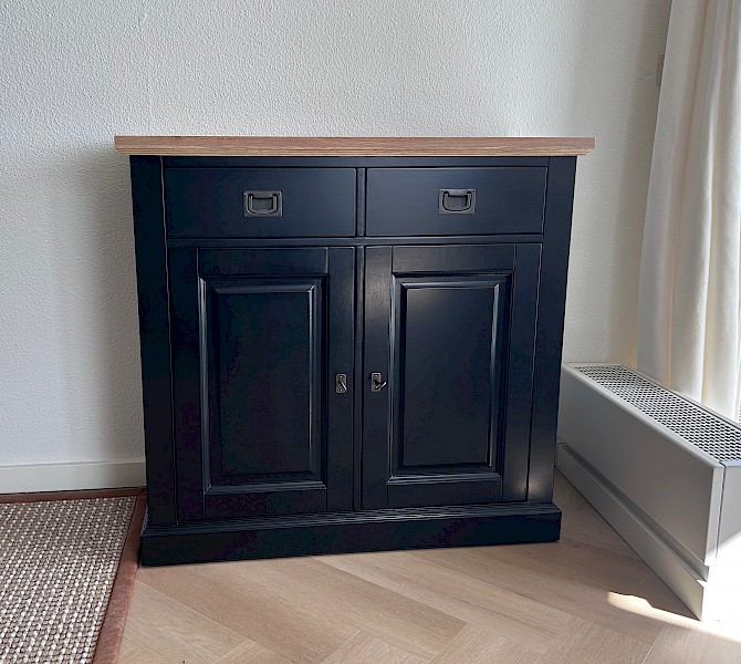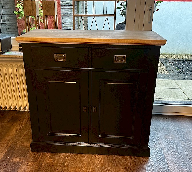Leuke smallere dressoir van 95 cm, 2 deurtjes, 2 lades en eiken bovenblad.