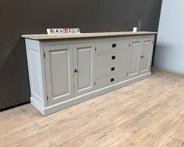Deze dressoir is 240 breed en heeft een strakke look nu in combi met gerookt eiken,super landelijke uitstraling hierdoor. Bevat 4 lades, waar soft closing is op geinstaleerd. De deurtjes hangen in metalen rails en gaan erg soepel. Ipv wit kan deze dressoir kan ook in alle andere RAL-kleuren gespoten worden. Ook in deze lijn in een kast ,tv meubel of salontafel te koop, kijk verder op onze site en vind de juiste combinatie.