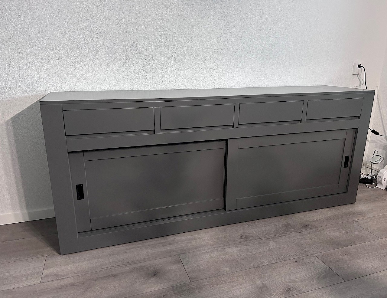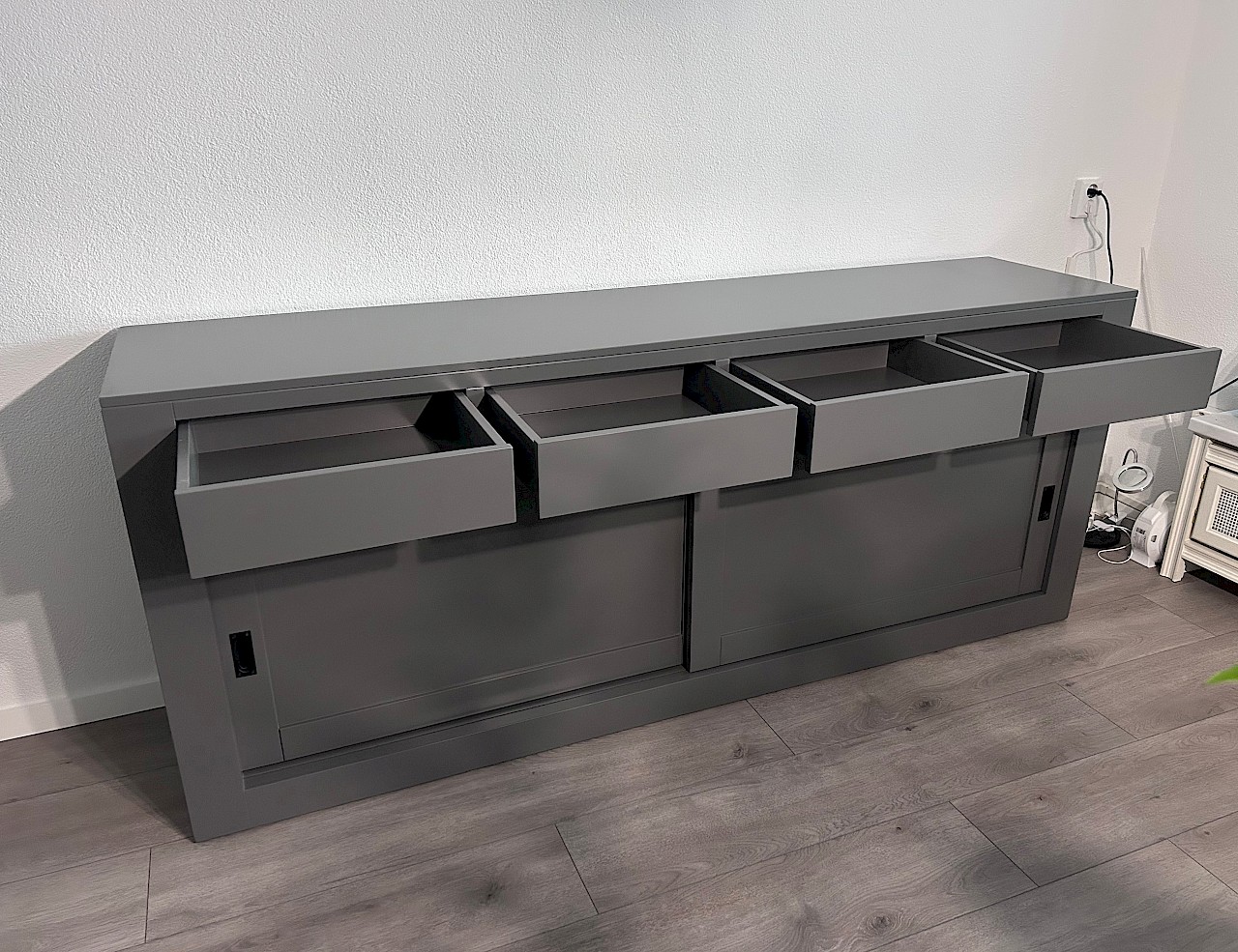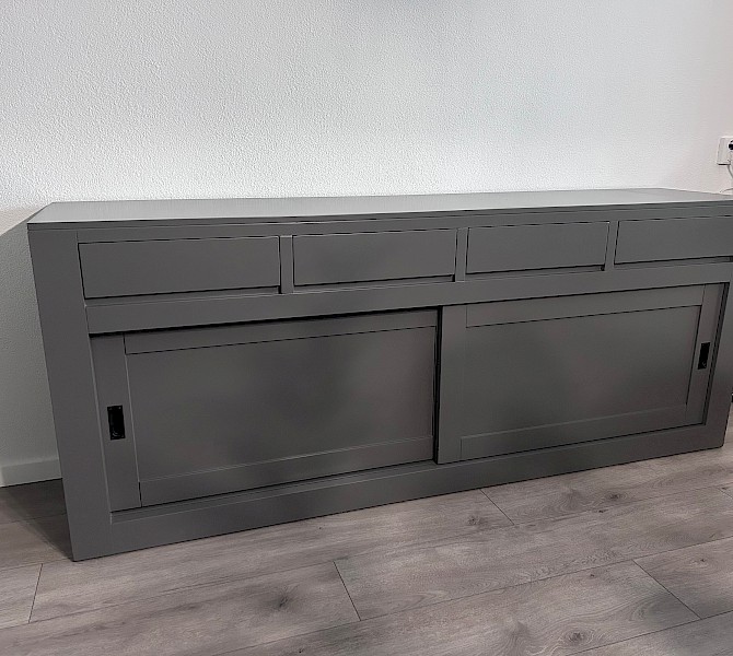 Deze dressoir heeft een elegante uitstraling. Bevat 3 laden met softclosing en greeploze lades. De deuren hangen in metalen rails en lopen heel stil. In plaats van murano kan dit dressoir ook worden gespoten in alle andere RAL-kleuren. Ook in deze lijn te koop in een kast, tv-meubel of salontafel.