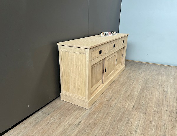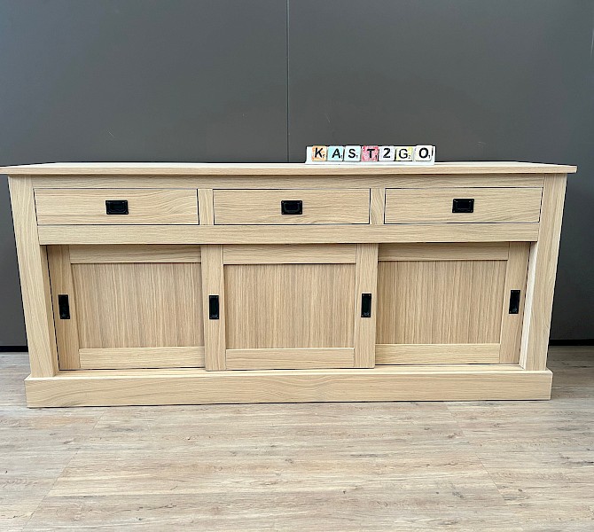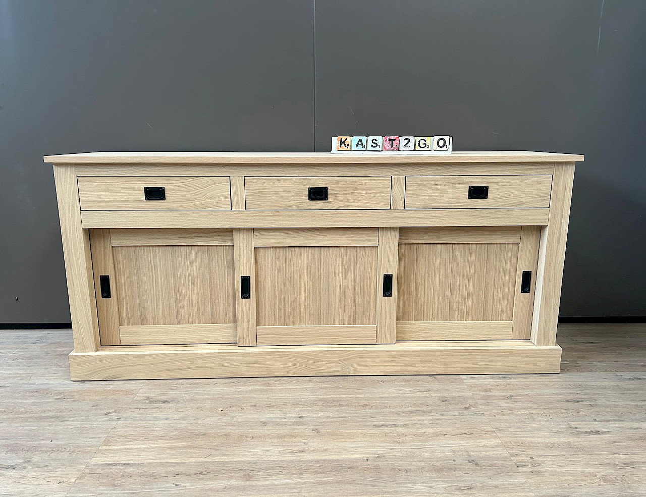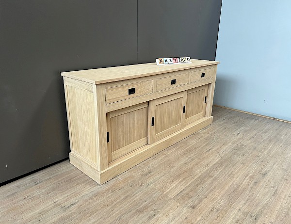 Deze strakke dressoir is combinatie met massief eiken en eiken vineer uitgevoerd, kwalitatief hoogwaardig afgewerkt, dat echt een massieve uitstraling heeft. De dressoir bestaat uit 1 gedeelte en daardoor makkelijk in vervoer. Dit model is ook in andere afmetingen verkrijgbaar, van 100cm tot 300cm breed. Ook in hoogtes kan gevarieerd worden. Er zijn ook andere varianten eiken verkrijgbaar, white wash eiken, grey wash eiken, donker eiken, etc... Bekijk de fotogalarij voor andere kleurenmonsters.