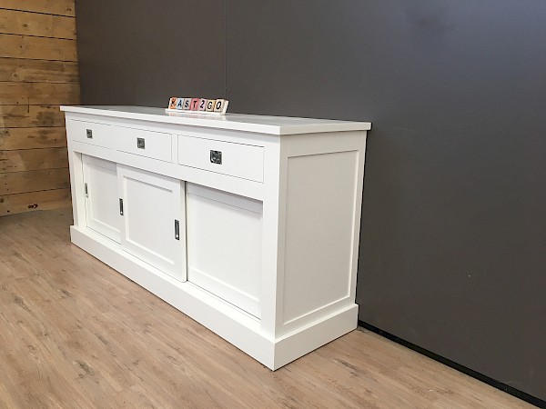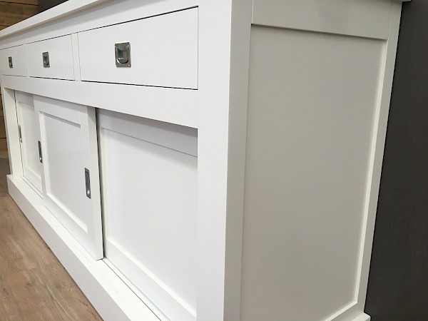 Deze dressoir is heeft een strakke look. Bevat 3 lades, waar soft closing is op geinstaleerd. De deurtjes hangen in metalen rails en gaan erg soepel. Ipv wit kan deze dressoir kan ook in kleur grijs, murano, zwart, verona en antraciet gespoten worden. Ook in deze lijn in een kast ,tv meubel of salontafel te koop, kijk verder op onze site en vind de juiste combinatie.