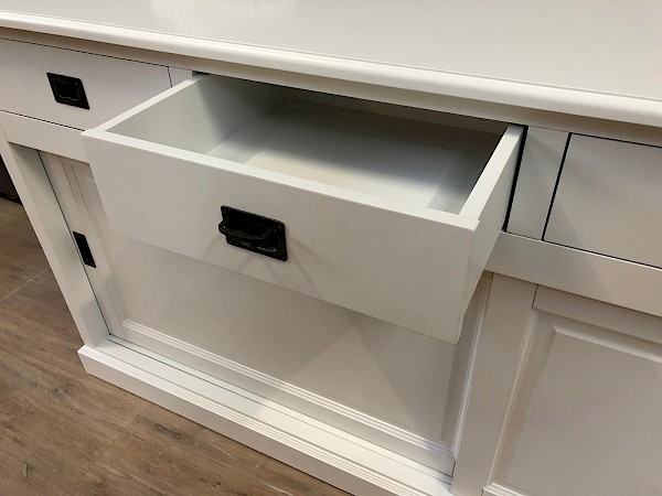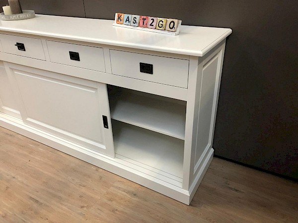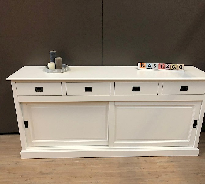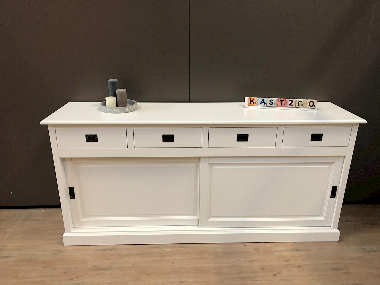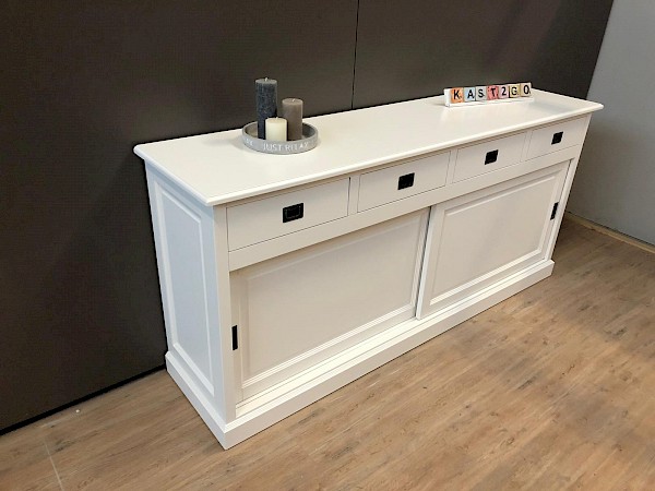 Deze dressoir is heeft een strakke look. Bevat 4 lades, waar soft closing is op geinstaleerd. De deurtjes hangen in metalen rails en gaan erg soepel. Ipv wit kan deze dressoir kan ook in kleur grijs, murano, zwart, verona en antraciet gespoten worden. ook in deze lijn in een kast ,tv meubel of salontafel te koop, kijk verder op onze site en vind de juiste combinatie. Wilt u eens komen kijken maak dan een afspraak en bezoek onze showroom