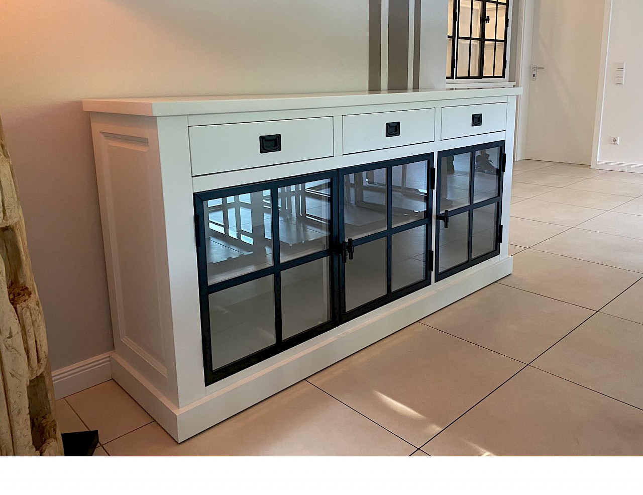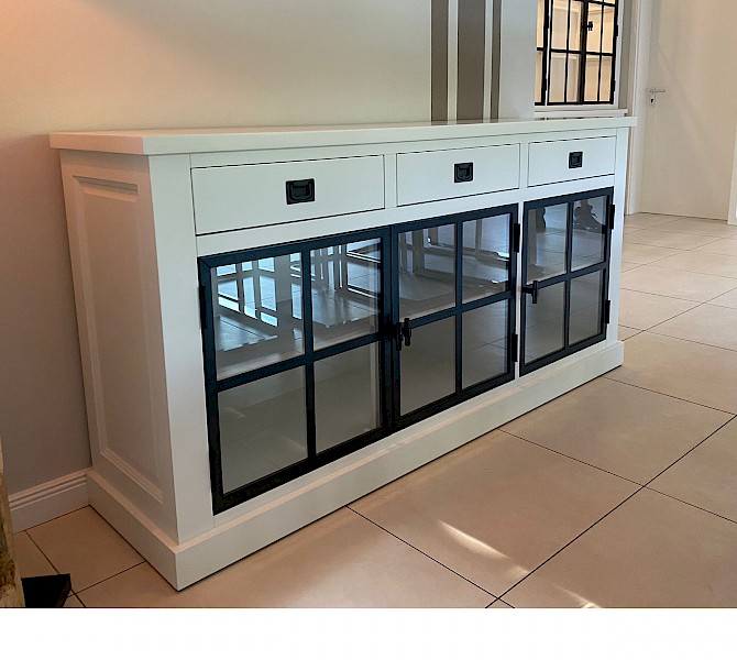 Deze uitvoering is in 180cm breed, maar de dressoir kan in alle verschillende breedtes tussen 100 en 300cm uitgevoerd worden. Ook diepte en hoogte kan desgewenst aangepast worden.