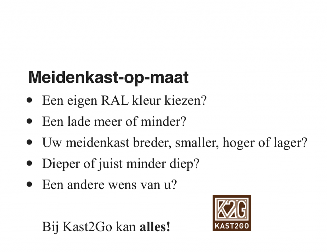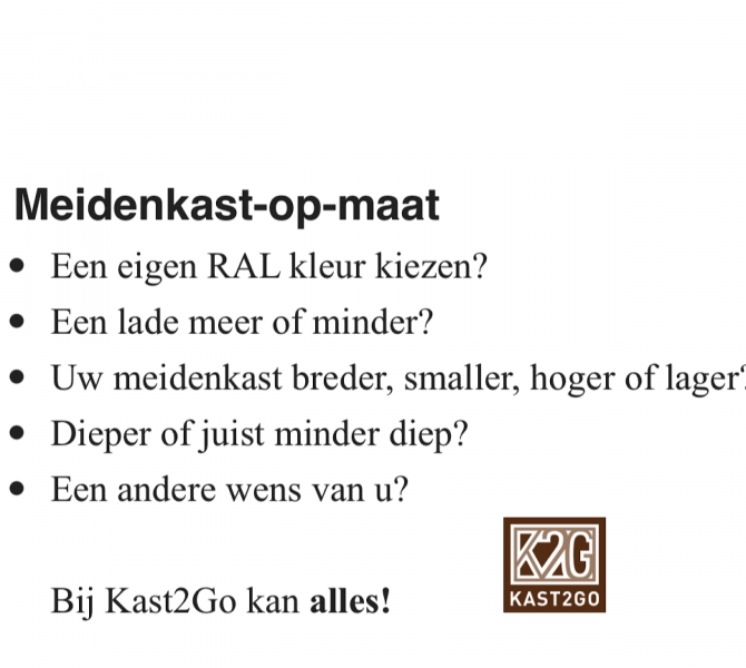 Bent u op zoek naar een meidenkast, maar wenst u een andere maatvoering? We kunnen de meidenkast voor u op maat maken: