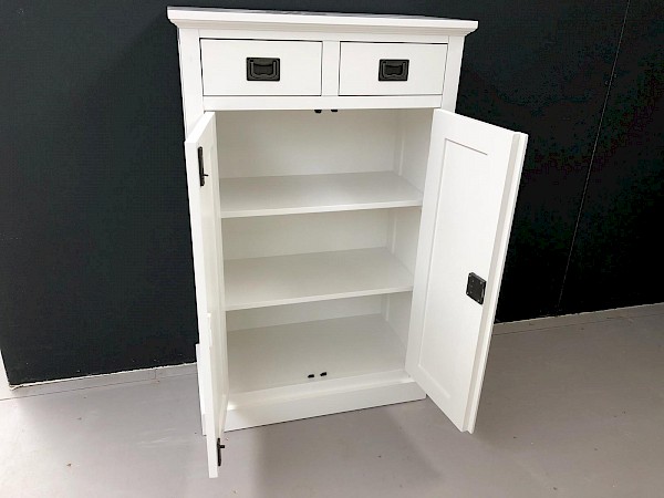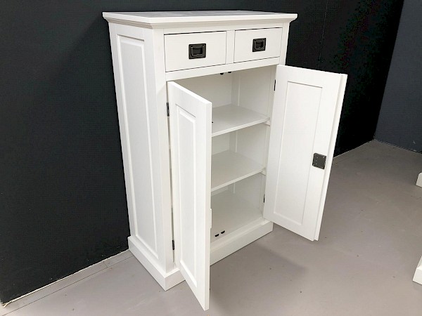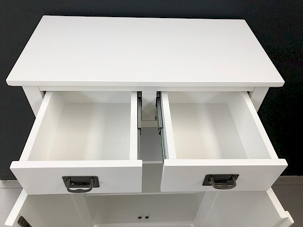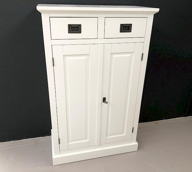 Afsluitbare meidenkast, met 2 laatjes en wit bovenblad. Fatsoenlijke kwaliteit! In dezelfde stijl als de gespoten buffetkasten.