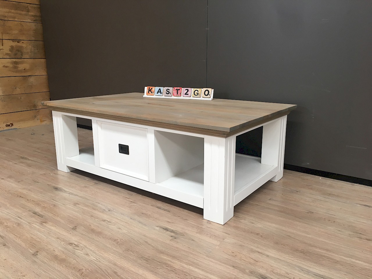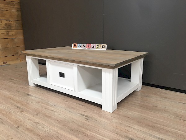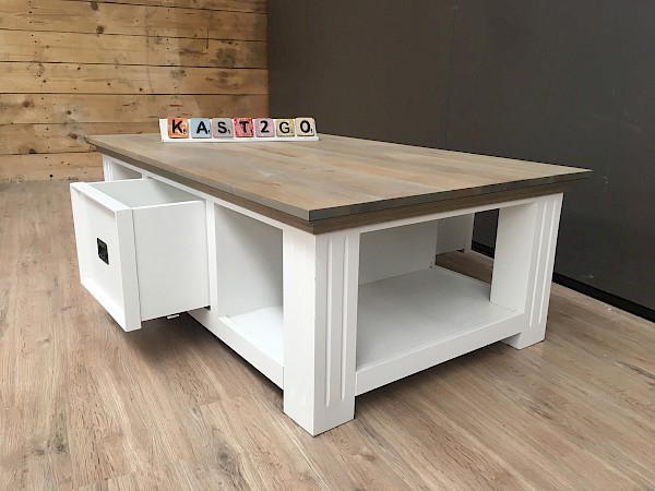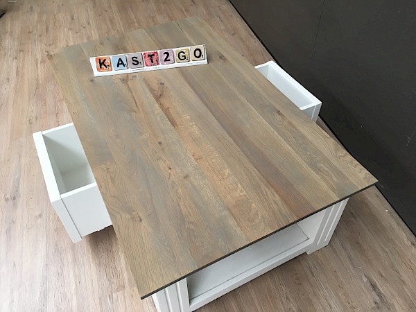 Glad gespoten salontafel met gerookt eiken blad. Past mooi in de lijn van buffetkast wit/eiken, dressoir wit/eiken, TVmeubel wit/eiken of meidenkast wit/eiken. Met softclosing op de lades, hoogwaardige afwerking dus!