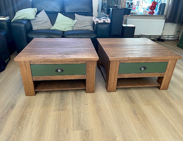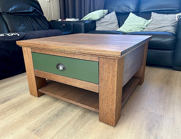 Massief eiken salontafel. De afmeting van de lade is 49cm breed en 43cm diep.