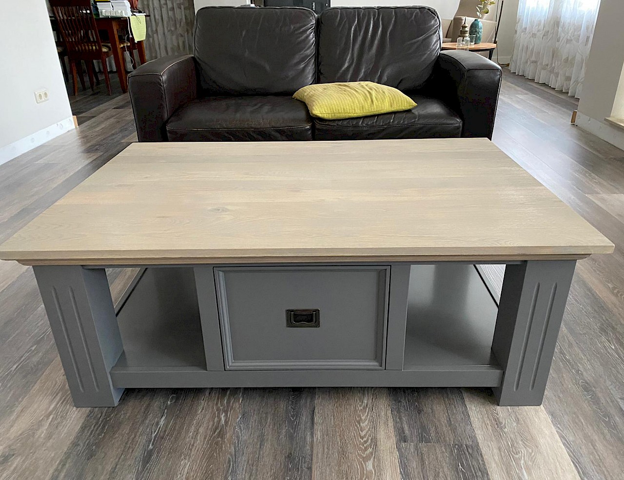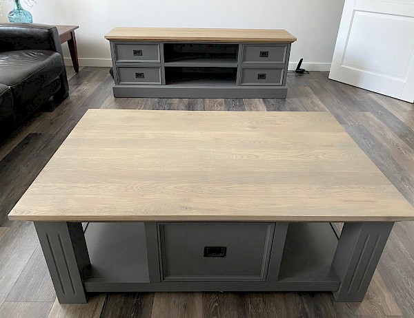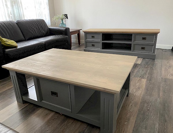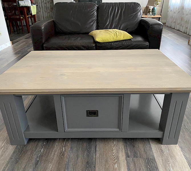 Glad gespoten salontafel met gerookt eiken blad. Past mooi in de lijn van buffetkast, dressoir, TVmeubels of meidenkast. Met softclosing op de lades, hoogwaardige afwerking dus!
