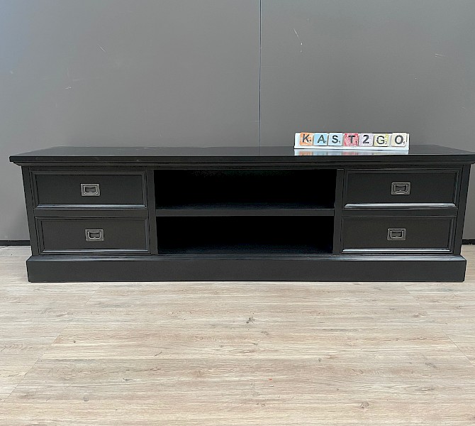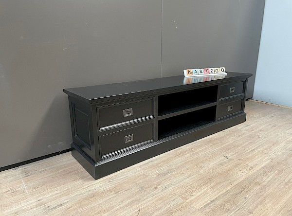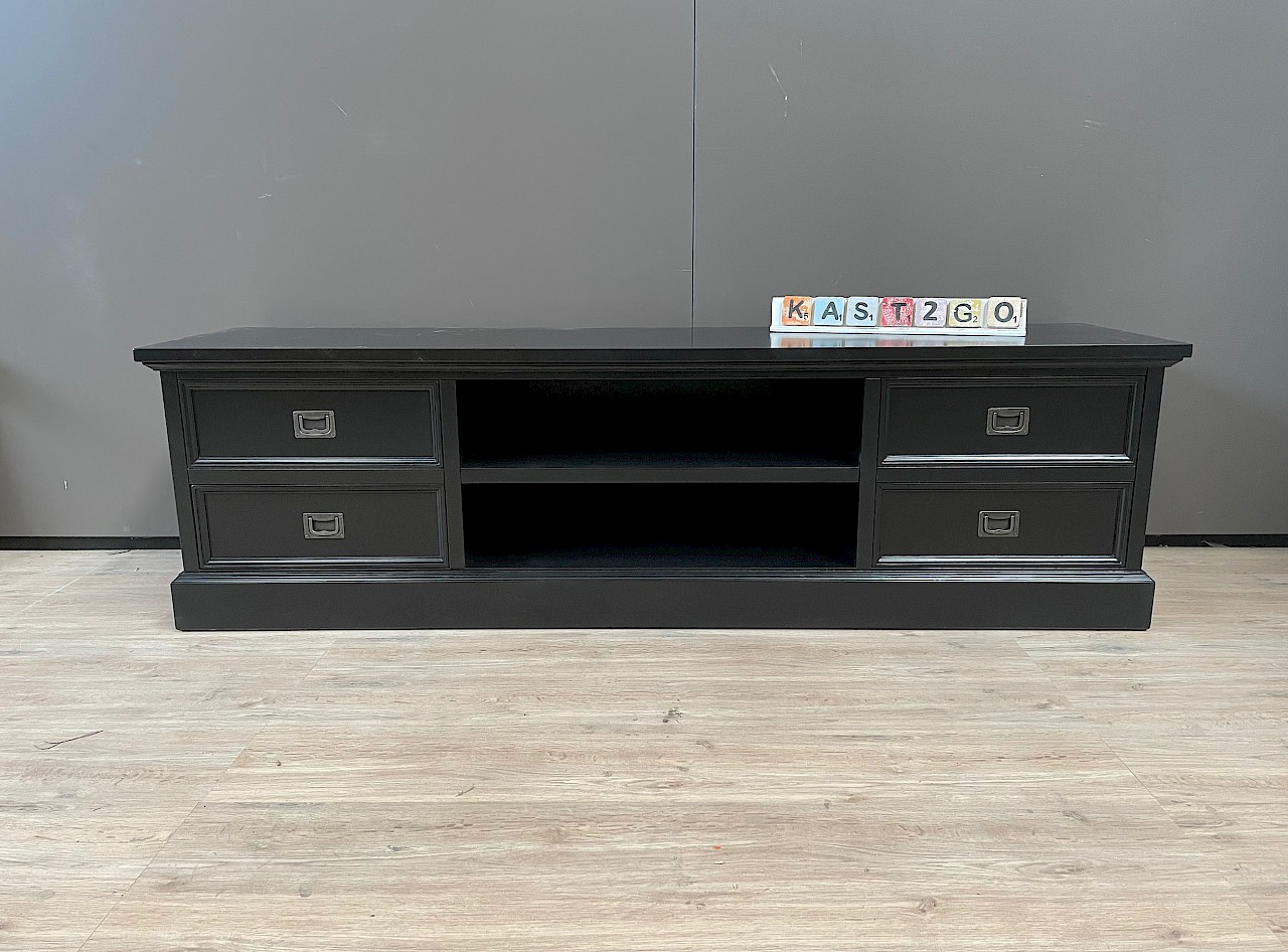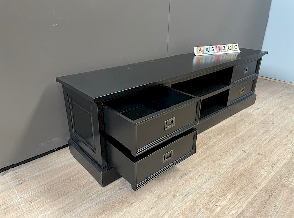 Glad gespoten TVmeubel in het geheel zwart.  Past mooi in de lijn met een van de glad gespoten buffetkasten of dressoirs. Tevens bijpassende salontafel en/of meidenkast verkrijgbaar. Ook in andere maten verkrijgbaar, Tevens ook met EIKEN top verkrijgbaar. Neem anders even contact voor meer informatie!
