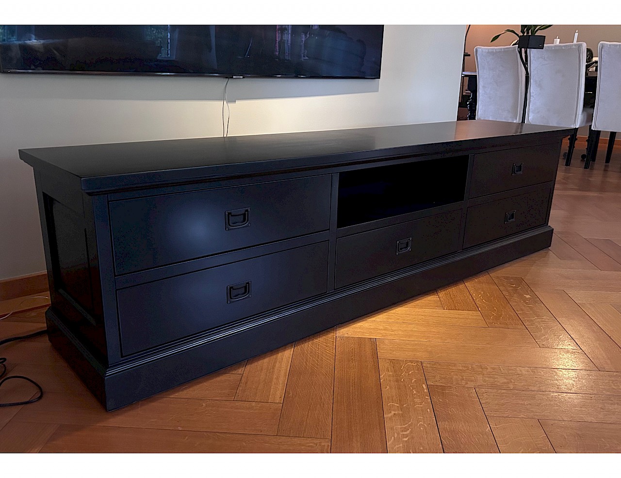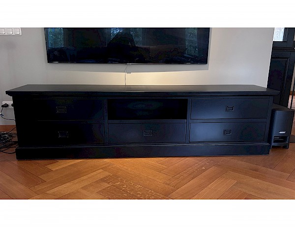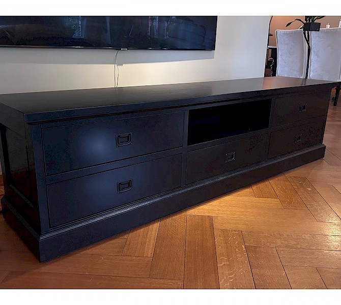 Glad gespoten TVmeubel in zwart.  Past mooi in de lijn met een van de glad gespoten buffetkasten of dressoirs. Tevens bijpassende salontafel en/of meidenkast verkrijgbaar. Ook in andere maten verkrijgbaar. Ook met eiken top verkrijgbaar. Uiteraard in alle gewenste RAL-kleuren te spuiten