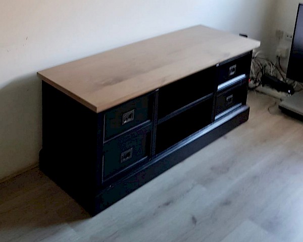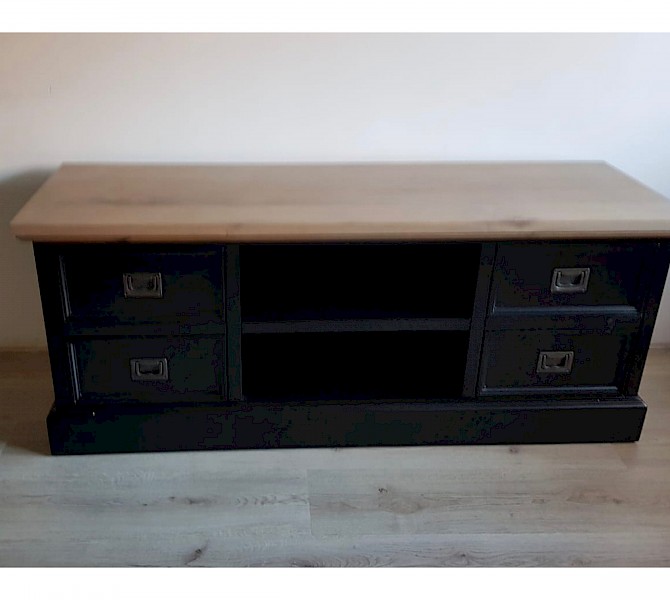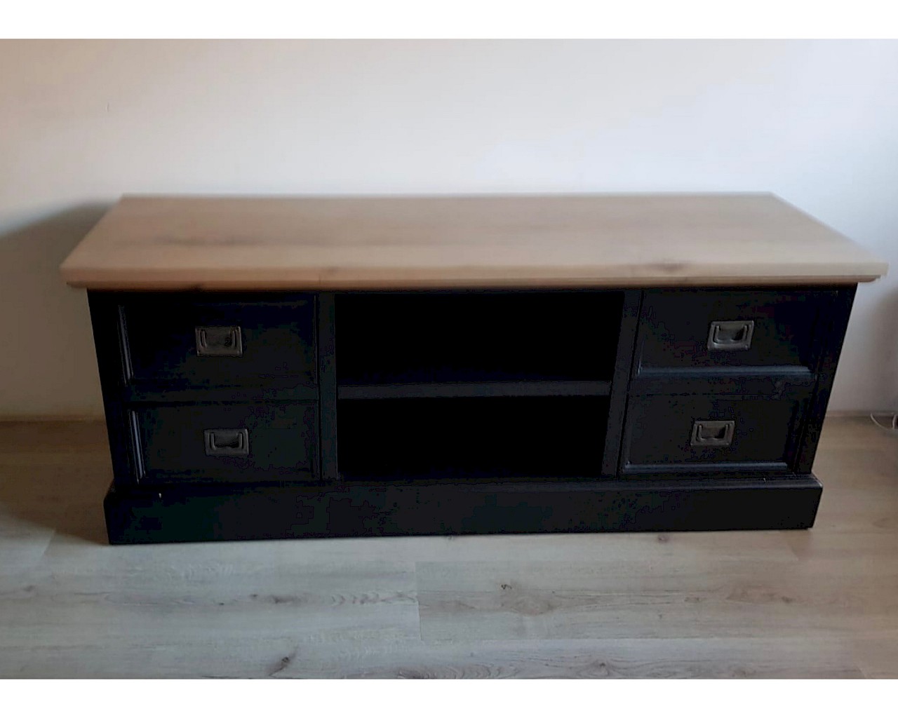 Glad gespoten TV-meubel in zwart met eiken top. Past mooi in de lijn met een van de glad gespoten grijze buffetkasten of dressoirs. Tevens bijpassende salontafel en/of meidenkast verkrijgbaar. Ook in 165 cm verkrijgbaar. Neem anders even contact voor meer informatie!