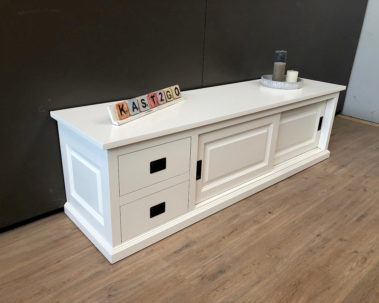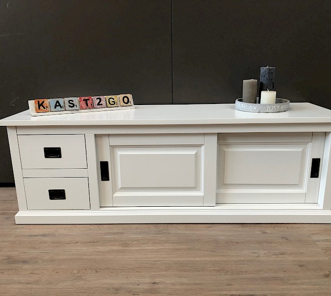 Glad gespoten TVmeubel in het geheel wit met 2 schuifdeuren en 2 lades op softclosing!