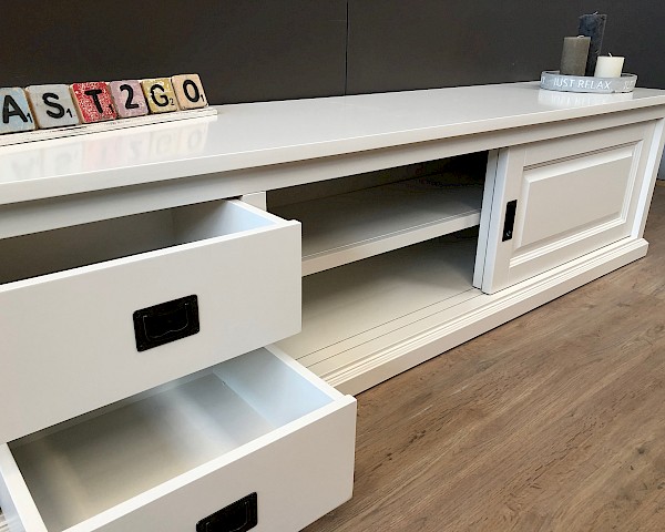 Glad gespoten TVmeubel in het geheel wit met 2 schuifdeuren en 2 lades op softclosing!