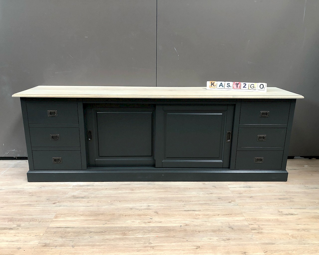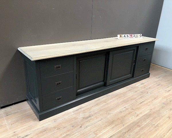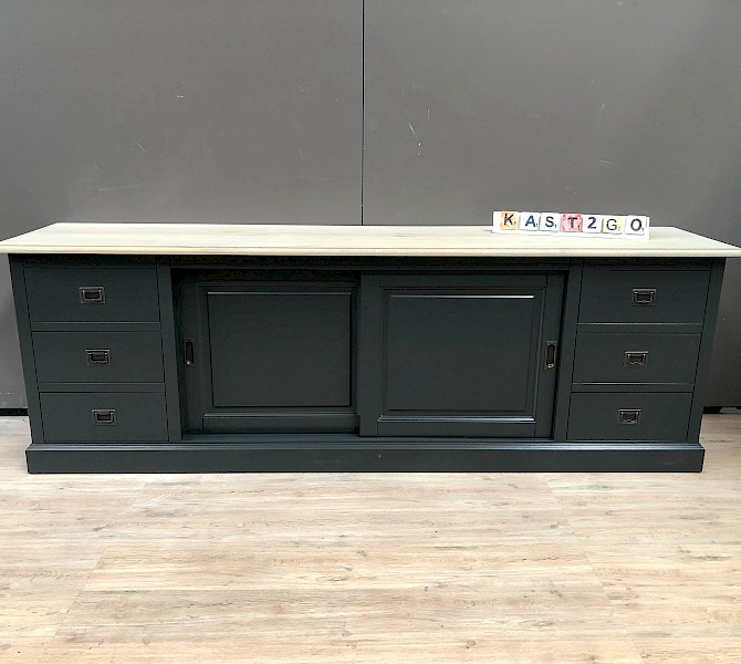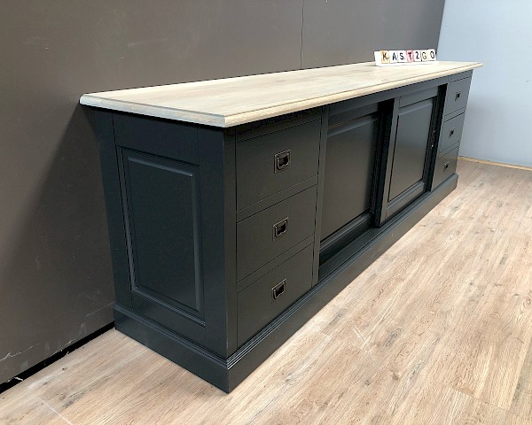 Heerlijk breed TV-meubel, met laatjes en schuifdeuren. Deze versie heeft een gerookte eiken top! Je kunt er veel in kwijt en altijd netjes achter de deurtjes verscholen.