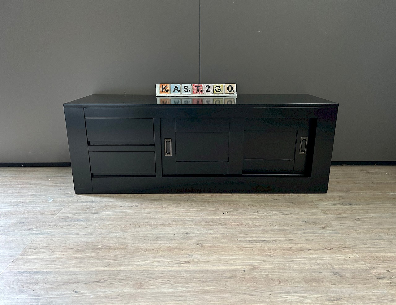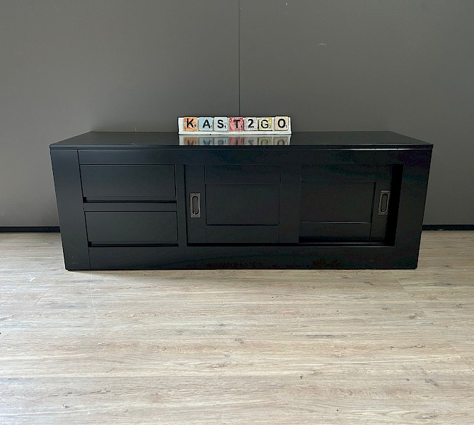 Glad gespoten strak TVmeubel met 2 schuifdeuren en 2 laxdes. Eventueel is het TVmeubel ook alleen met schuifdeuren verkrijgbaar, dus zonder lades.